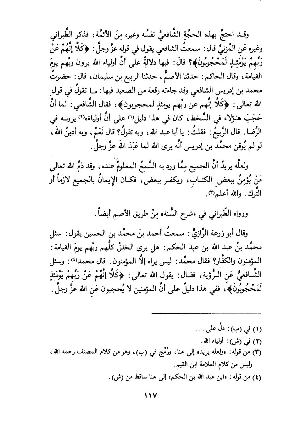 وقال أبو زرعة الرَّازي. سمعت أحمد بن محمد بن الحسين يقول: سئل محمد بن عبد الله بن عبد الحكم: هل يرى الخلق كلُّهم ربَّهم يوم القيامة: المؤمنون والكفار؟ فقال محمد: ليس يراه إلاَّ المؤمنون. قال محمد (¬4): وسئل الشافعي عن الرؤية، فقال: يقول الله تعالى: {كلاَّ إنَّهم عن ربِّهِم يومئذٍ لمحجُوبُونَ}، ففي هذا دليل على أن المؤمنين لا يُحجبون عن الله عز وجل.