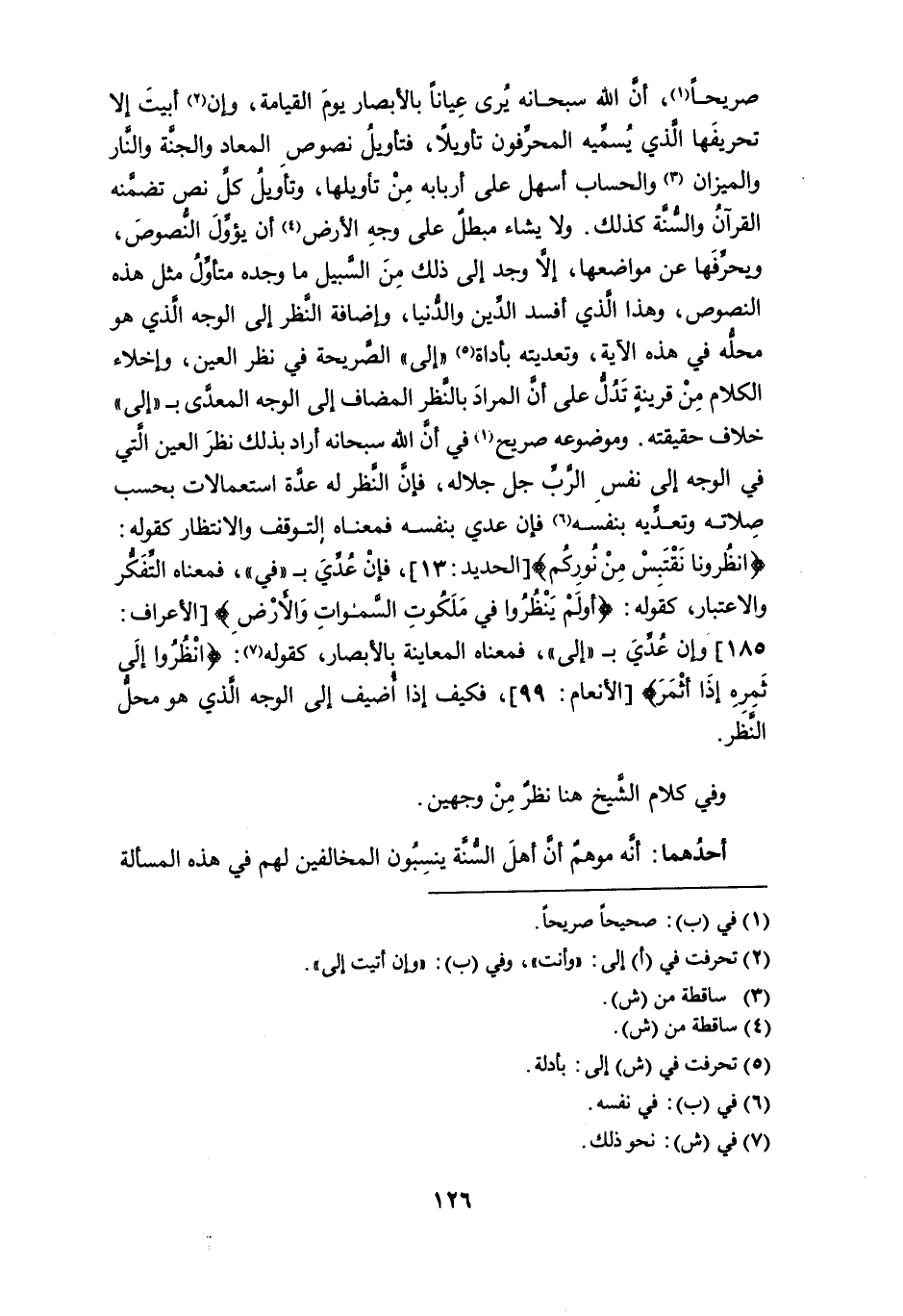 صريحاً (¬1)، أن الله سبحانه يُرى عياناً بالأبصار يوم القيامة، وإن (¬2) أبيت إلا تحريفها الذي يُسمِّيه المحرِّفون تأويلاً، فتأويل نصوص المعاد والجنة والنار والميزان (¬3) والحساب أسهل على أربابه من تأويلها، وتأويل كلِّ نص تضمَّنه القرآن والسنة كذلك. ولا يشاء مبطلٌ على وجه الأرض (¬4) أن يؤوِّلَ النصوص، ويحرِّفَها عن مواضعها، إلاَّ وجد إلى ذلك مِنَ السبيل ما وجده متأوِّل مثل هذه النصوص، وهذا الذي أفسد الدين والدنيا، وإضافة النظر إلى الوجه الذي هو محلُّه في هذه الآية، وتعديته بأداة (¬5) " إلى " الصريحة في نظر العين، وإخلاء الكلام من قرينة تدلُّ على أن المراد بالنظر المضاف إلى الوجه المعدَّى بـ " إلى " خلاف حقيقته. وموضوعه صريح (1)، في أن الله سبحانه أراد بذلك نظر العين التي في الوجه إلى نفس الرب جل جلاله، فإن النظر له عدة استعمالات بحسب صلاته وتعدِّيه بنفسه (¬6) فإن عدي بنفسه فمعناه التوقف والانتظار كقوله: {انْظُرُونَا نَقْتَبِسْ مِنْ نُورِكُمْ} [الحديد: 13]، فإنْ عُدِّيَ بـ " في "، فمعناه التفكر والاعتبار، كقوله: {أَوَلَمْ يَنْظُرُوا فِي مَلَكُوتِ السَّمَاوَاتِ وَالْأَرْضِ} [الأعراف: 185] وإن عُدِّيَ بـ " إلى "، فمعناه المعاينة بالأبصار، كقوله (¬7): {انْظُرُوا إِلَى ثَمَرِهِ إِذَا أَثْمَرَ} [الأنعام: 99]، فكيف إذا أُضيف إلى الوجه الذي هو محلُّ النَّظر.