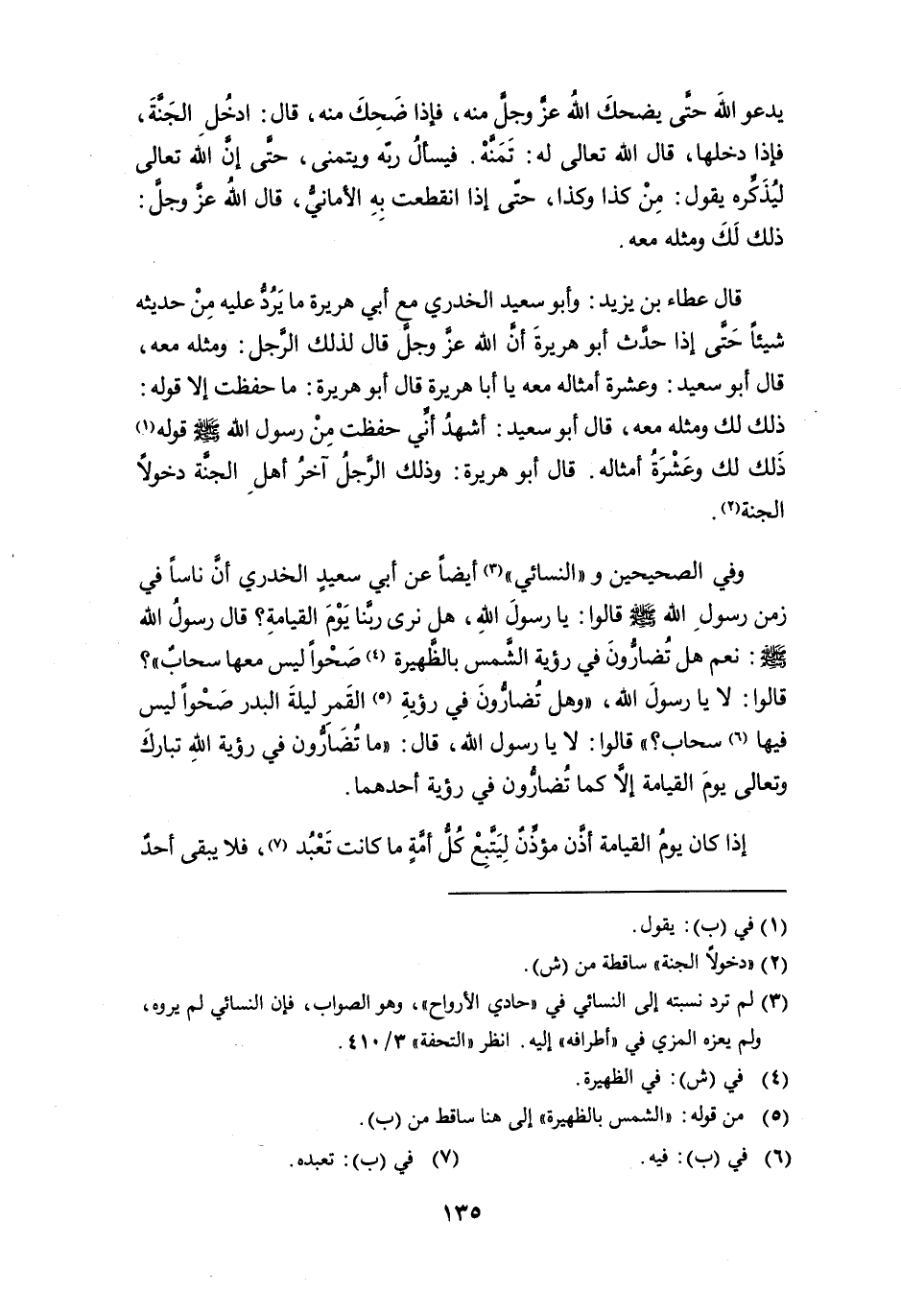 وفي الصحيحين و" النسائي " (¬3) أيضاً عن أبي سعيدٍ الخدري أن ناساً في زمن رسول الله - صلى الله عليه وسلم - قالوا: يا رسول الله، هل نرى ربنا يوم القيامة؟ قال رسول الله - صلى الله عليه وسلم -: نعم هل تُضارُّون في رؤية الشمس بالظهيرة (¬4) صَحْواً ليس معها سحاب "؟ قالوا: لا يا رسول الله، " وهل تُضارُّون في رؤية (¬5) القمر ليلة البدر صحواً ليس فيها (¬6) سحاب؟ " قالوا: لا يا رسول الله، قال: " ما تضارون في رؤية الله تبارك وتعالى يوم القيامة إلاَّ كما تضارون في رؤية أحدهما.