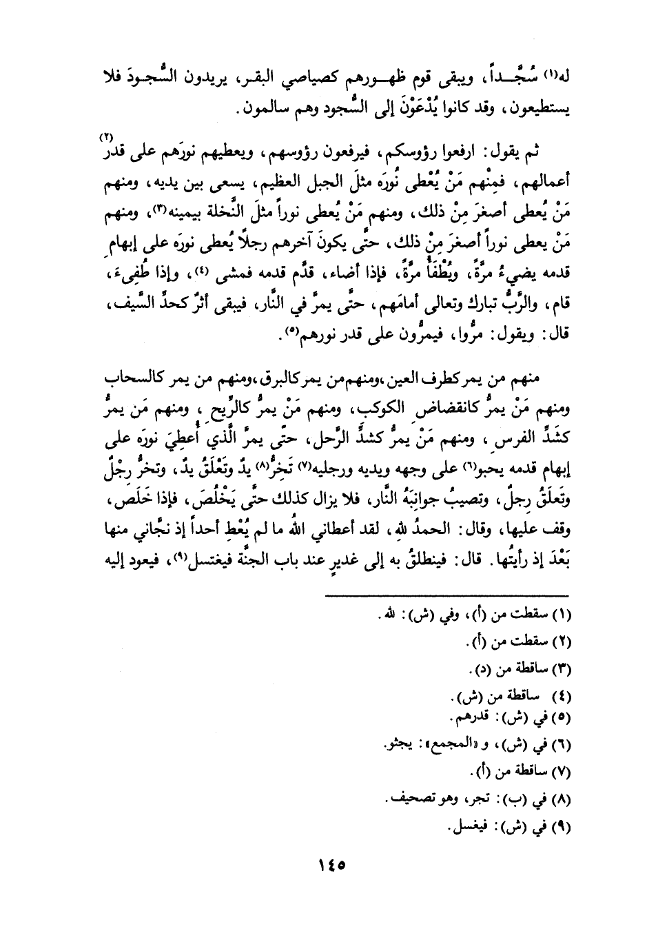 ثم يقول: ارفعوا رؤوسكم، فيرفعون رؤوسهم، ويعطيهم نورهم على قدر (¬2) أعمالهم، فمنهم من يُعطى نوره مثل الجبل العظيم، يسعى بين يديه، ومنهم من يُعطى أصغر من ذلك، ومنهم من يُعطى نوراً مثل النخلة بيمينه (¬3)، ومنهم من يعطى نوراً أصغر من ذلك، حتى يكون آخرهم رجلاً يعطى نوره على إبهام قدمه يضيءُ مرُّة، ويُطفَأُ مرة، فإذا أضاء، قدَّم قدمه فمشى (¬4)، وإذا طُفِىء، قام، والرَّبُّ تبارك وتعالى أمامهم، حتى يمرَّ في النار، فيبقى أثرٌ كحدِّ السيف، قال: ويقول: مرُّوا، فيمرون على قدر نورهم (¬5).