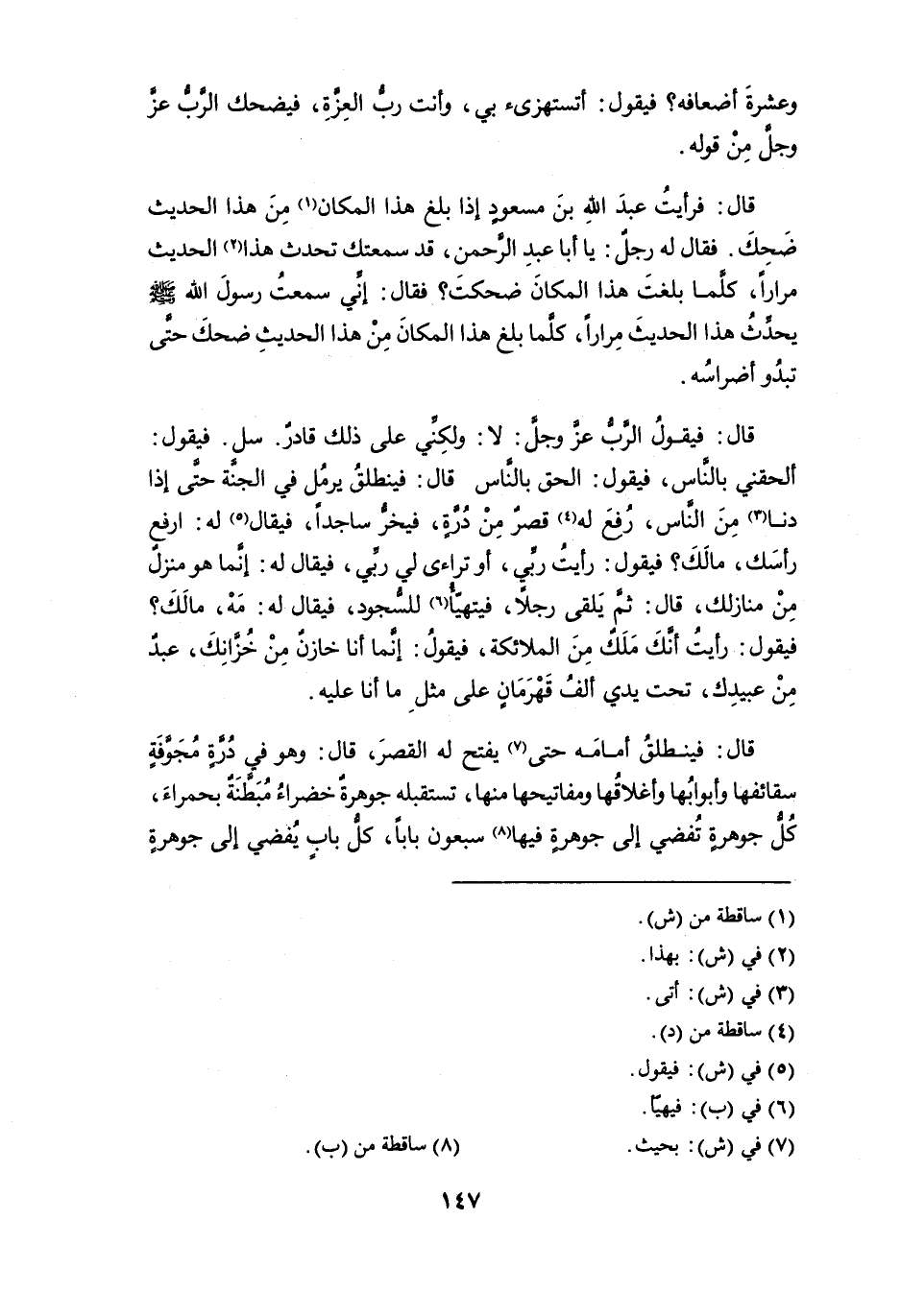 قال: فرأيت عبد الله بن مسعود إذا بلغ هذا المكان (¬1) من هذا الحديث ضَحِكَ. فقال له رجل: يا أبا عبد الرحمن، قد سمعتك تحدث هذا (¬2) الحديث مراراً، كلما بلغت هذا المكان ضحكتَ؟ فقال: إني سمعت رسول الله - صلى الله عليه وسلم - يحدِّث هذا الحديث مراراً، كلما بلغ هذا المكان من هذا الحديث ضحك حتى تبدو أضراسه.