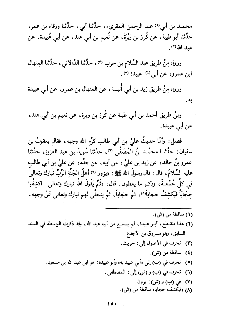 فصل: وأما حديث علي بن أبي طالب كرَّم الله وجهه، فقال يعقوب بن سفيان: حدثنا محمد بن المُصَفَّى (¬6)، حدثنا سُويدُ بن عبد العزيز، حدثنا عمرو بن خالد، عن زيد بن عليٍّ، عن أبيه، عن جده، عن عليِّ بن أبي طالب عليه السلام، قال: قال رسول الله - صلى الله عليه وسلم -: " يزور (¬7) أهلُ الجنة الرب تبارك وتعالى في كل جُمعَة، وذكر ما يعطون. قال: " ثم يقول الله تبارك وتعالى: اكشِفُوا حجاباً فيَكشِفُ حجاباً (¬8)، ثم حجاباً، ثم يتجلى لهم تبارك وتعالى عن وجهه،