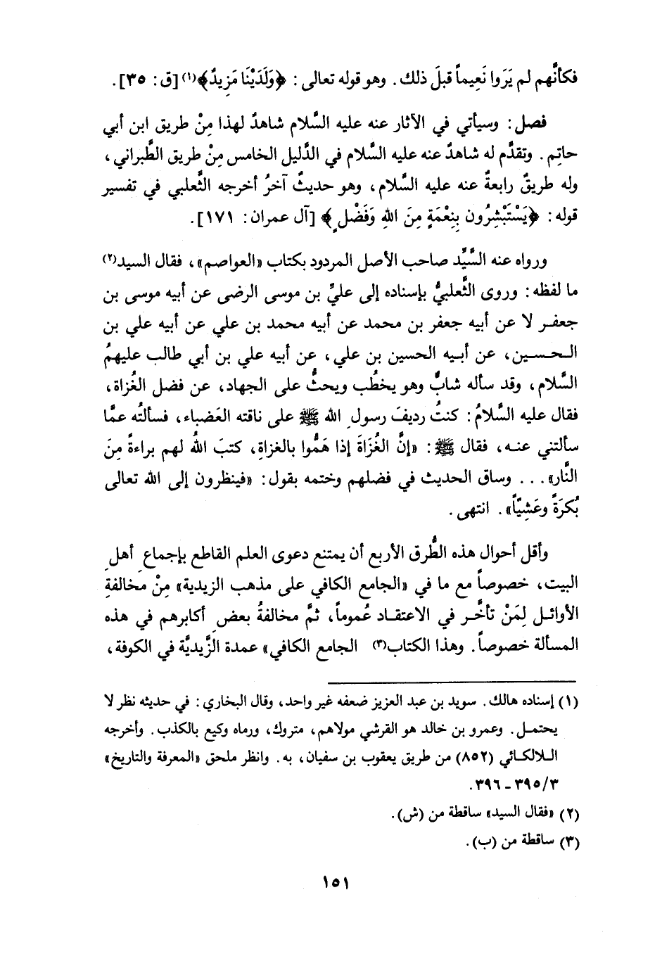 ورواه عنه السيد صاحب الأصل المردود بكتاب " العواصم "، فقال السيد (¬2) ما لفظه: وروى الثعلبي بإسناده إلى عليِّ بن موسى الرضى عن أبيه موسى بن جعفر لا عن أبيه جعفر بن محمد عن أبيه محمد بن علي عن أبيه علي بن الحسين، عن أبيه الحسين بن علي، عن أبيه علي بن أبي طالب عليهم السلام، وقد سأله شابٌ وهو يخطب ويحثُّ على الجهاد، عن فضل الغُزاة، فقال عليه السلام: كنت رديفَ رسول الله - صلى الله عليه وسلم - على ناقته العضباء، فسألته عما سألتني عنه، فقال - صلى الله عليه وسلم -: " إن الغُزَاة إذا همُّوا بالغزاة، كتب الله لهم براءة من النار " ... وساق الحديث في فضلهم وختمه بقول: " فينظرون إلى الله تعالى بُكرةً وعَشِيّاً ". انتهى.