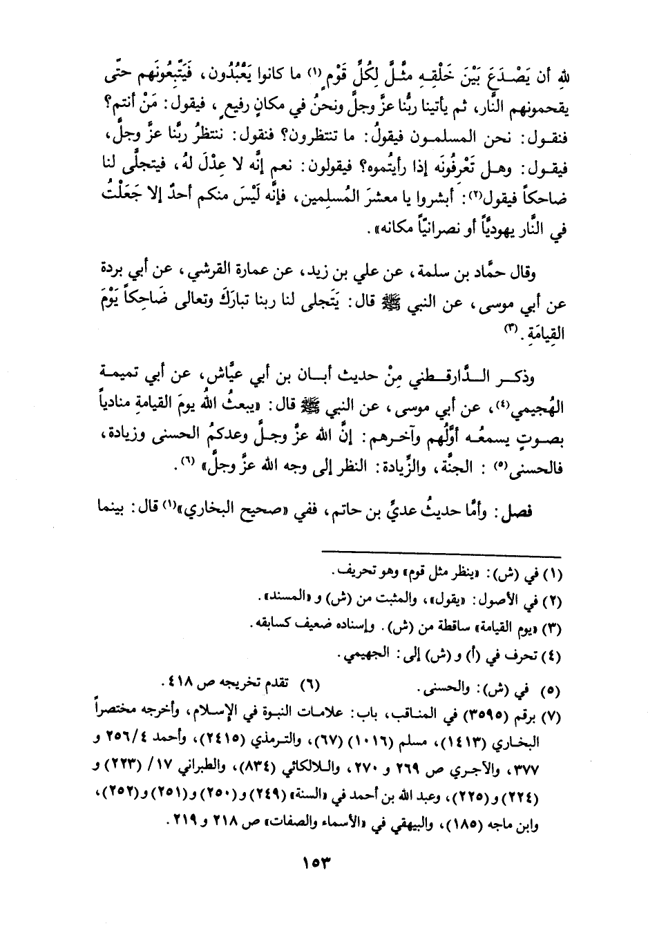 وقال حماد بن سلمة، عن علي بن زيد، عن عمارة القرشي، عن أبي بردة عن أبي موسى، عن النبي - صلى الله عليه وسلم - قال: يتجلى لنا ربنا تبارك وتعالى ضاحكاً يوم القيامة (¬3).