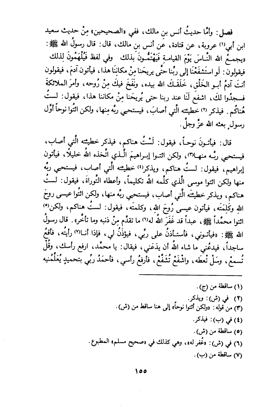 فصل: وأما حديث أنس بن مالك، ففي " الصحيحين، من حديث سعيد ابن أبي (¬1) عروبة، عن قتادة، عن أنس بن مالك، قال: قال رسول الله - صلى الله عليه وسلم -: " يجمع الله الناس يوم القيامة فيهتَمُّون بذلك وفي لفظ فيُلهمون لذلك فيقولون: لو استشفعنا إلى ربنا حتى يريحنا من مكاننا هذا، فيأتون آدم، فيقولون أنت آدم أبو الخلق، خلقك الله بيده، ونفخ فيك من روحه، وأمر الملائكة فسجدوا لك، اشفع لنا عند ربنا حتى يُريحنا من مكاننا هذا، فيقول: لست هُناكُم. فيذكر (¬2) خطيئته التي أصاب، فيستحيي ربه منها، ولكن ائتوا نوحاً أول رسولٍ بعثه الله عز وجل.