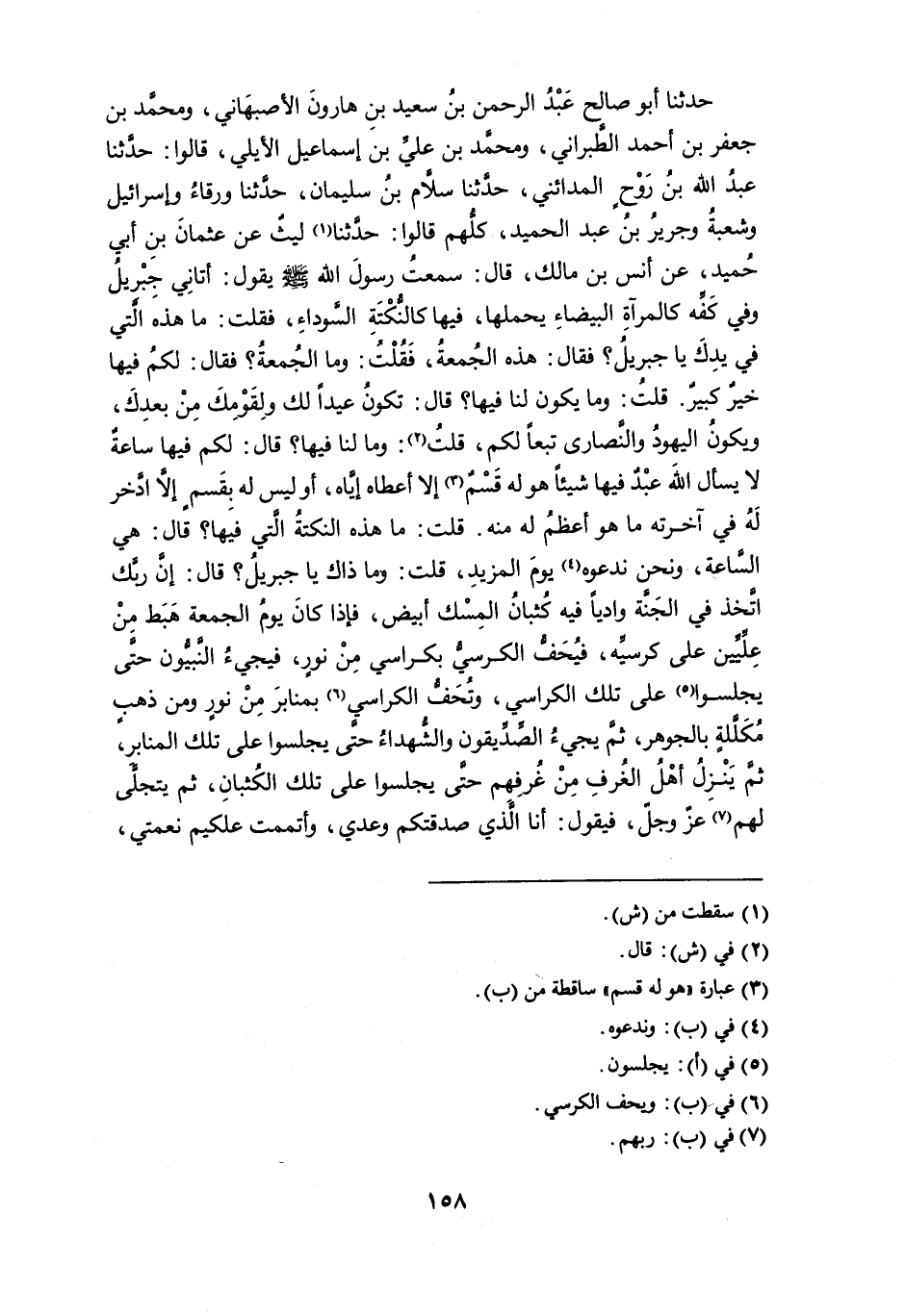 حدثنا أبو صالح عبد الرحمن بن سعيد بن هارون الأصبهاني، ومحمد بن جعفر بن أحمد الطبراني، ومحمد بن علي بن إسماعيل الأيلي، قالوا: حدثنا عبد الله بن روحٍ المدائني، حدثنا سلام بن سليمان، حدثنا ورقاءُ وإسرائيل وشعبة وجرير بن عبد الحميد، كلهم قالوا: حدثنا (¬1) ليثٌ عن عثمان بن أبي حُميد، عن أنس بن مالك، قال: سمعت رسول الله - صلى الله عليه وسلم - يقول: أتاني جبريل وفي كفِّه كالمرآة البيضاء يحملها، فيها كالنُّكتَة السوداء، فقلت: ما هذه التي في يدِكَ يا جبريل؟ فقال: هذه الجمعة، فقلت: وما الجُمعة؟ فقال: لكم فيها خيرٌ كبيرٌ. قلت: وما يكون لنا فيها؟ قال: تكون عيداً لك ولقومك من بعدك، ويكون اليهود والنصارى تبعاً لكم، قلت (¬2): وما لنا فيها؟ قال: لكم فيها ساعة لا يسأل الله عبدٌ فيها شيئاً هو له قسمٌ (¬3) إلاَّ أعطاه إياه، أو ليس له بقسمٍ إلاَّ ادَّخر لهُ في آخرته ما هو أعظم له منه. قلت: ما هذه النكتة التي فيها؟ قال: هي الساعة، ونحن ندعوه (¬4) يوم المزيد، قلت: وما ذاك يا جبريل؟ قال: إن ربك اتَّخذ في الجنة وادياً فيه كُثبانُ المسك أبيض، فإذا كان يوم الجمعة هبط من عِلِّيِّين على كرسيه، فيُحَفُّ الكرسيُّ بكراسي من نورٍ، فيجيء النبيون حتى يجلسوا (¬5) على تلك الكراسي، وتُحَفُّ الكراسي (¬6) بمنابر من نورٍ ومن ذهبٍ مُكَلَّلةٍ بالجوهر، ثم يجيء الصديقون والشهداء حتى يجلسوا على تلك المنابر، ثم ينزل أهل الغرف من غُرفِهم حتى يجلسوا على تلك الكُثبان، ثم يتجلى لهم (¬7) عز وجل، فيقول: أنا الذي صدقتكم وعدي، وأتممت علكيم نعمتي،