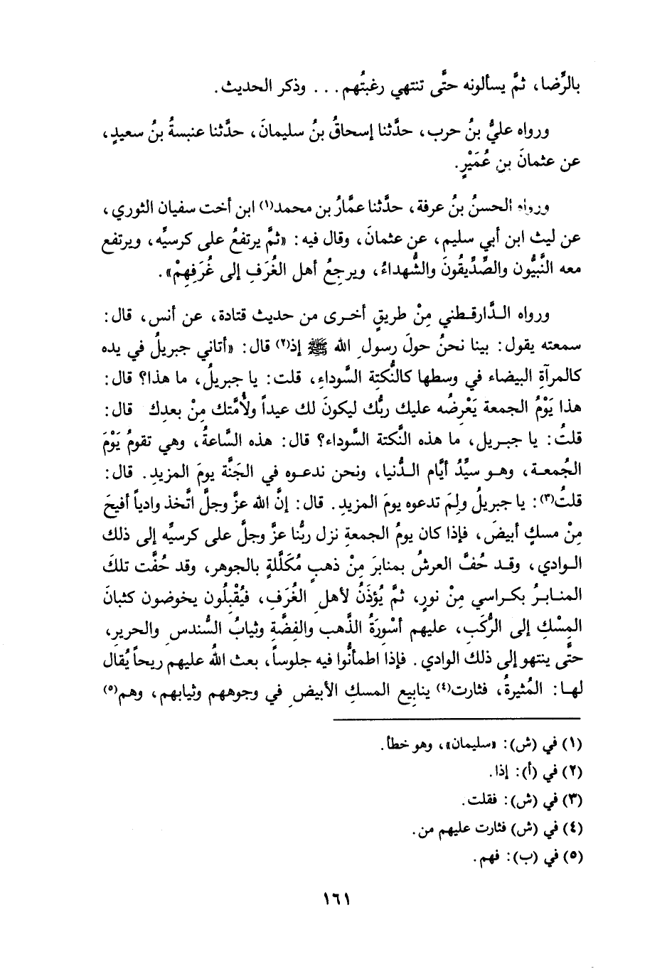 ورواه الدارقطني من طريق أخرى من حديث قتادة، عن أنس، قال: سمعته يقول: بينا نحن حول رسول الله - صلى الله عليه وسلم - إذ (¬2) قال: " أتاني جبريل في يده كالمرآة البيضاء في وسطها كالنكتة السوداء، قلت: يا جبريل، ما هذا؟ قال: هذا يوم الجمعة يعرضه عليك ربك ليكون لك عيداً ولأُمَّتك من بعدك قال: قلت: يا جبريل، ما هذه النكتة السوداء؟ قال: هذه الساعة، وهي تقوم يوم الجمعة، وهو سيد أيام الدنيا، ونحن ندعوه في الجنة يوم المزيد. قال: قلت (¬3): يا جبريل ولِمَ تدعوه يوم المزيد. قال: إن الله عزَّ وجلَّ اتخذ وادياً أفيح من مسكٍ أبيض، فإذا كان يوم الجمعة نزل ربُّنا عزَّ وجلَّ على كرسيه إلى ذلك الوادي، وقد خُفَّ العرش بمنابر من ذهبٍ مُكَلَّلةٍ بالجوهر، وقد حُفَّت تلك المنابر بكراسي من نورٍ، ثم يُؤذن لأهل الغرف، فيُقبلون يخوضون كثبان المسك إلى الرُّكَبِ، عليهم أسورة الذهب والفضة وثياب السندس والحرير، حتى ينتهو إلى ذلك الوادي. فإذا اطمأنوا فيه جلوساً، بعث الله عليهم ريحاً يقال لها: المُثيرة، فثارت (¬4) ينابيع المسك الأبيض في وجوههم وثيابهم، وهم (¬5)