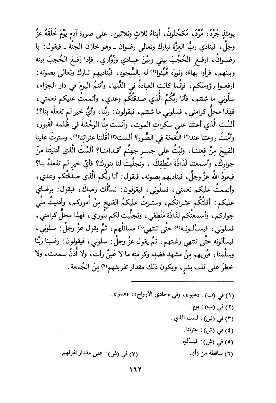 يومئذ جُرْدٌ، مُرْدٌ، مُكَحَّلون، أبناء ثلاث وثلاثين، على صورة آدم يوم خلقه عز وجل، فينادي ربُّ العزة تبارك وتعالى رضوان -وهو خازن الجنة- فيقول: يا رضوان، ارفع الحُجُب بيني وبين عبادي وزُوَّاري. فإذا رفع الحجب بينه وبينهم، فرأوا بهاءه ونوره هُيِّئوا (¬1) له بالسجود، فيناديهم تبارك وتعالى بصوته: ارفعوا رؤوسكم، فإنما كاذت العبادة في الدنيا، وأنتم اليوم في دار الجزاء، سلوني ما شئتم، فأنا ربكم الذي صدقتكم وعدي، وأتممت عليكم نعمتي، فهذا محلُّ كرامتي، فسلوني ما شئتم، فيقولون: ربنا، وأيُّ خير لم تفعله بنا؟! ألستَ الذي أعنتنا على سكرات الموت، وآنست منا الوحشة في ظلمة القبور، وأمَّنت روعتنا عند (¬2) النفخة في الصور؟ ألست (¬3) أقلتنا عثراتنا (¬4)، وسترت علينا القبيح من فعلنا، وثبَّتَّ على جسر جهنَّم أقدامنا؟ ألست الذي أدنيتنا من جوارك، وأسمعتنا لَذَاذَةَ منطقك، وتجلَّيت لنا بنورك؟ فأي خيرٍ لم تفعله بنا؟ فيعود الله عز وجل، فيناديهم بصوته، فيقول: أنا ربكم الذي صدقتكم وعدي، وأتممت عليكم نعمتي، فسلُوني، فيقولون: نسألك رضاك، فيقول: برضاي عليكم: أقلتُكُم عثراتكم، وسترتُ عليكم القبيح من أموركم، وأدنيتُ مني جواركم، وأسمعتكم لذاذة منطقي، وتجليت لكم بنوري، فهذا محل كرامتي، فسلوني، فيسألونه (¬5) حتى تنتهي (¬6) مسائلهم، ثم يقول عز وجل: سلوني، فيسألونه حتى تنتهي رغبتهم، ثم يقول عز وجل: سلوني، فيقولون: رضينا ربنا وسلَّمنا، فيُريهم من مشهد فضله وكرامته ما لا عينٌ رأت، ولا أُذنٌ سمعت، ولا خطر على قلب بشرٍ، ويكود ذلك مقدار تفريقهم (¬7) من الجمعة.