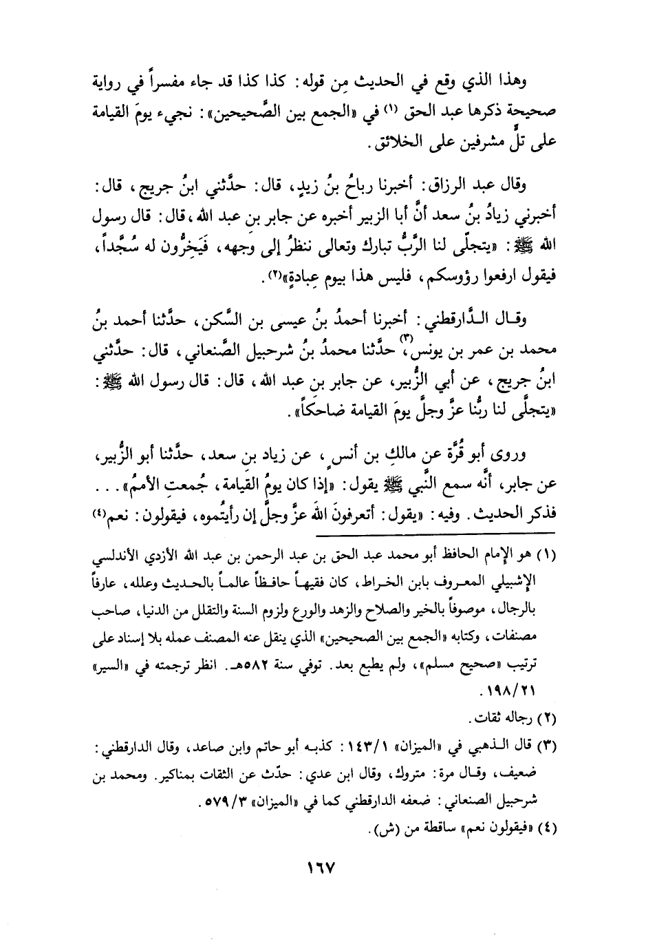وقال عبد الرزاق: أخبرنا رباح بن زيد، قال: حدثني ابن جريج، قال: أخبرني زيادُ بن سعد أن أبا الزبير أخبره عن جابر بن عبد الله، قال: قال رسول الله - صلى الله عليه وسلم -: " يتجلى لنا الرب تبارك وتعالى ننظر إلى وجهه، فيَخِرُّون له سُجَّداً، فيقول ارفعوا رؤوسكم، فليس هذا بيوم عبادةٍ " (¬2).