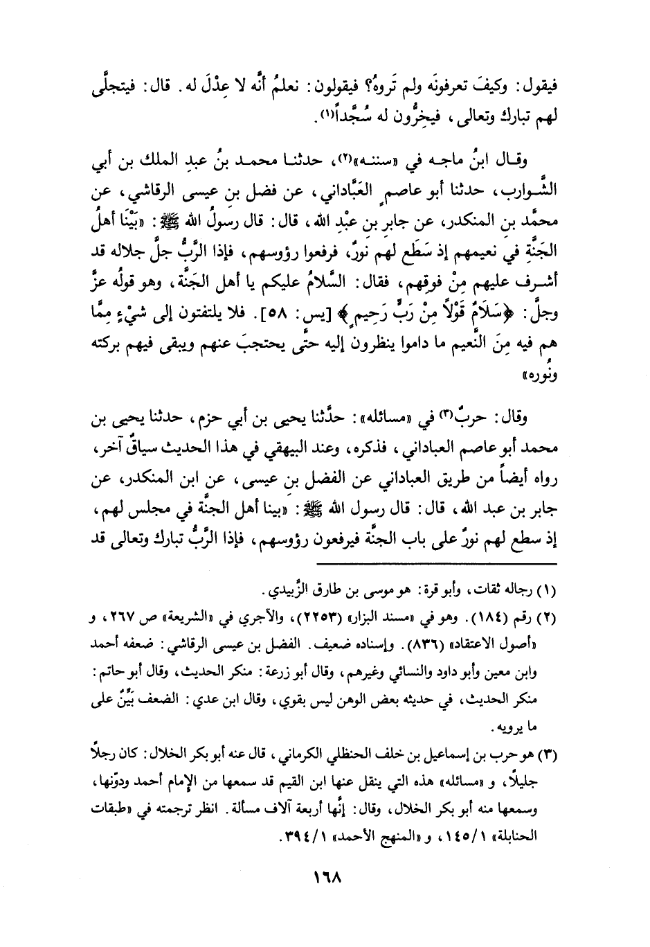 وقال: حربٌ (¬3) في " مسائله ". حدثنا يحيى بن أبي حزم، حدثنا يحيى بن محمد أبو عاصم العباداني، فذكره، وعند البيهقي في هذا الحديث سياقٌ آخر، رواه أيضاً من طريق العباداني عن الفضل بن عيسى، عن ابن المنكدر، عن جابر بن عبد الله، قال: قال رسول الله - صلى الله عليه وسلم -: " بينا أهل الجنة في مجلس لهم، إذ سطع لهم نورٌ على باب الجنة فيرفعون رؤوسهم، فإذا الرب تبارك وتعالى قد
