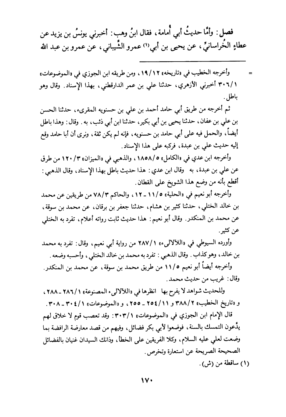 وللحديث شواهد لا يفرح بها انظرها في " اللآلالىء المصنوعة " 1/ 286 - 288، و" تاريخ الخطيب " 2/ 388 و11/ 254 - 255، و" الموضوعات " 1/ 304 - 308.