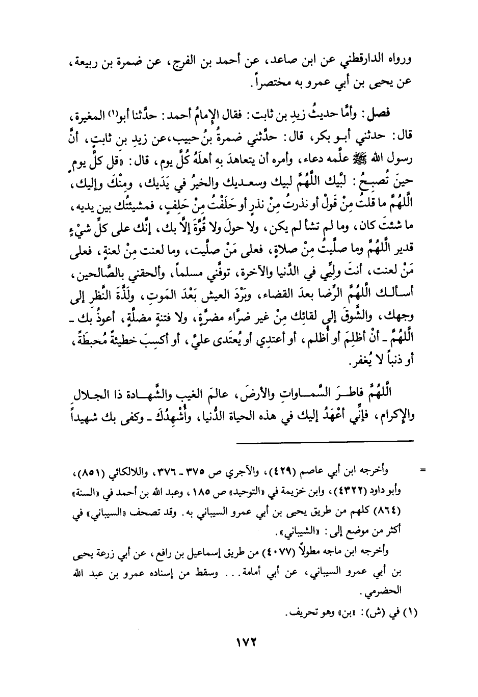 فصل: وأما حديث زيد بن ثابت: فقال الإمام أحمد: حدثنا أبو (¬1) المغيرة، قال: حدثني أبو بكر، قال: حدثني ضمرة بن حبيب، عن زيد بن ثابت، أن رسول الله - صلى الله عليه وسلم - علَّمه دعاء، وأمره أن يتعاهد به أهله كل يوم، قال: " قل كل يوم حين تصبح: لبيك اللهم لبيك وسعديك والخير في يديك، ومنك وإليك، اللهم ما قلتُ من قول أو نذرتُ من نذرٍ أو حلفتُ من حَلفٍ، فمشيئتك ببن يديه، ما شئت كان، وما لم تشأ لم يكن، ولا حول ولا قوة إلاَّ بك، إنك على كل شيءٍ قدير اللهم وما صليت من صلاةٍ، فعلى من صليت، وما لعنت من لعنة، فعلى من لعنت، أنت وليي في الدنيا والآخرة، توفني مسلماً، وألحقني بالصالحين، أسألك اللهم الرضا بعد القضاء، وبَرْدَ العيش بعد الموت، ولذة النظر إلى وجهك، والشوق إلي لقائك من غير ضرَّاء مضرَّة، ولا فتنةٍ مضلَّةٍ، أعوذ بك -اللهم- أن أظلِمَ أو أُظلم، أو أعتدي أو يُعتدى عليَّ، أو أكسِبَ خطيئةً مُحبطًة، أو ذنباً لا يُغفر.
