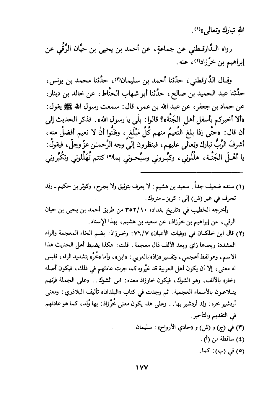 وقال الدارقطني، حدثنا أحمد بن سليمان (¬3)، حدثنا محمد بن يونس، حدثنا عبد الحميد بن صالح، حدثنا أبو شهاب الحنَّاط، عن خالد بن دينار، عن حماد بن جعفر، عن عبد الله بن عمر، قال: سمعت رسول الله - صلى الله عليه وسلم - يقول: " ألا أخبركم بأسفل أهل الجنة "؟ قالوا: بلى يا رسول الله ". فذكر الحديث إلى أن قال: " حتى إذا بلغ النعيم منهم كُلَّ مبلغٍ، وظنوا أن لا نعيم أفضل منه، أشرف الرب تبارك وتعالى عليهم، فينظرون إلى وجه الرحمن عز وجل، فيقول: يا أهل الجنة، هلِّلُوني، وكبِّروني وسبِّحوني بما (¬5) كنتم تهللوني وتكبروني