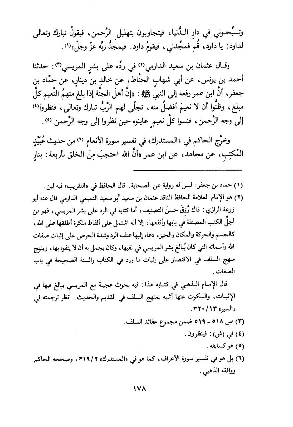 (¬2) هو الإمام العلامة الحافظ الناقد عثمان بن سعيد أبو سعيد التميمي الدارمي قال عنه أبو زرعة الرازي: ذاك رُزِقَ حسنَ التصنيف، أما كتابه في الرد على بشر المريسي، فهو من أجلِّ الكتب المصنفة في بابها وأنفعها، إلاَّ أنه اشتمل على ألفاظ منكرة أطلقها على الله، كالجسم والحركة والمكان والحيز، دعاه إليها عنف الرد وشدة الحرص على إثبات صفات الله وأسمائه التي كان يُبالغ بشر المريسي في نفيها، وكان يجمل به أن لا يتفوه بها، وينهج منهج السلف في الاقتصار على إثبات ما ورد في الكتاب والسنة الصحيحة في باب الصفات.