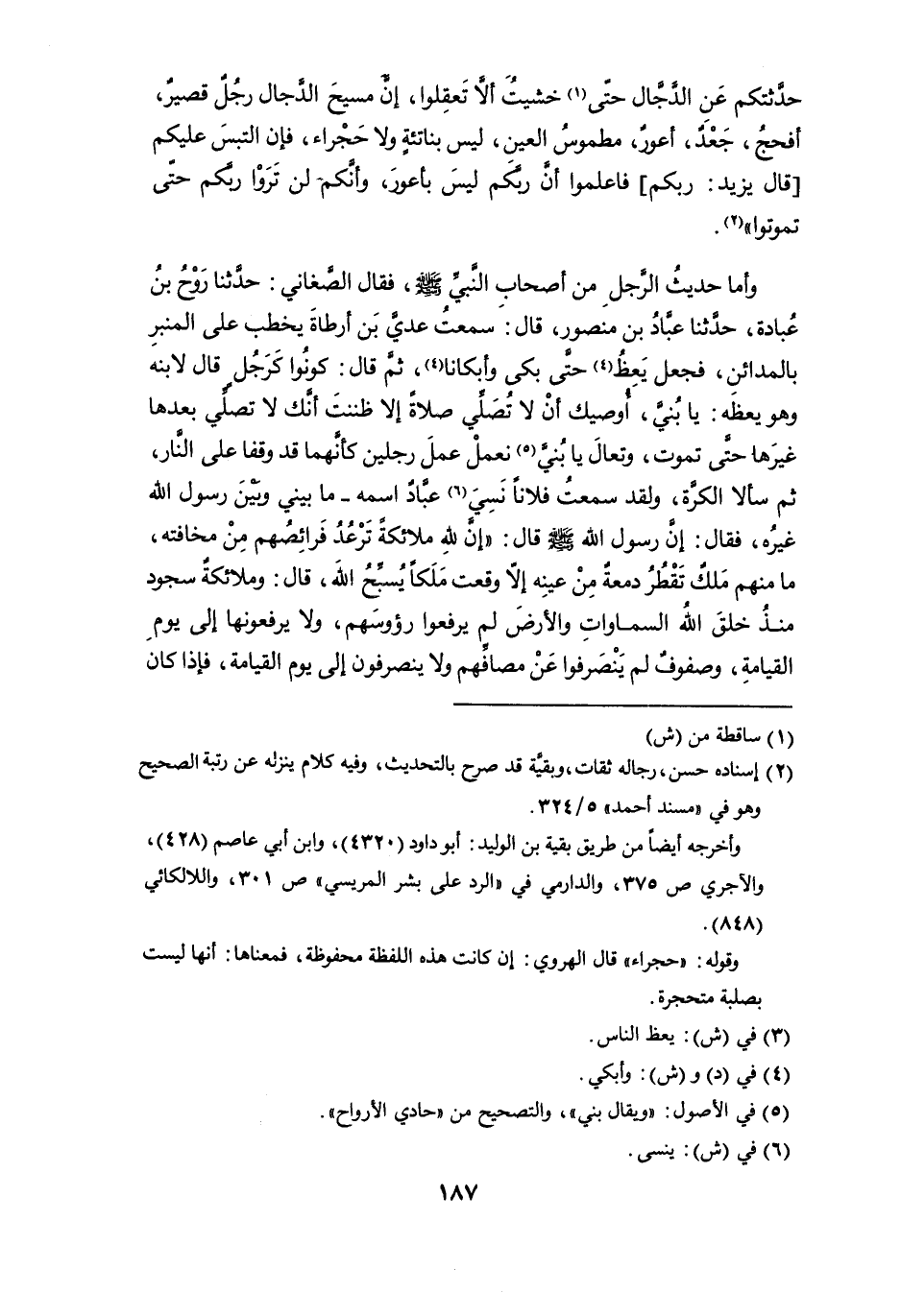 وأما حديثُ الرَّجل من أصحاب النبي - صلى الله عليه وسلم -، فقال الصغاني: حدثنا روح بن عُبادة، حدثنا عباد بن منصور، قال: سمعت عديَّ بن أرطاة يخطب على المنبر بالمدائن، فجعل يَعِظُ (¬3) حتى بكى وأبكانا (¬4)، ثم قال: كونُوا كرجل قال لابنه وهو يعظه: يا بُني، أوصيك أن لا تُصَلَّي صلاة إلاَّ ظننت أنك لا تصلي بعدها غيرها حتى تموت، وتعال يا بني (¬5) نعمل عمل رجلين كأنهما قد وقفا على النار، ثم سألا الكرَّة، ولقد سمعت فلاناً نَسِيَ (¬6) عبَّادٌ اسمه - ما بيني وبين رسول الله غيره، فقال: إن رسول الله - صلى الله عليه وسلم - قال: "إن لله ملائكة ترعُدُ فرائصهم من مخافته، ما منهم مَلكٌ تقطُرُ دمعةٌ من عينه إلاَّ وقعت مَلَكاً يسبح الله، قال: وملائكة سجود منذ خلق الله السماوات والأرض لم يرفعوا رؤوسهم، ولا يرفعونها إلى يوم القيامة، وصفوفٌ لم ينصرفوا عن مصافِّهم ولا ينصرفون إلى يوم القيامة، فإذا كان