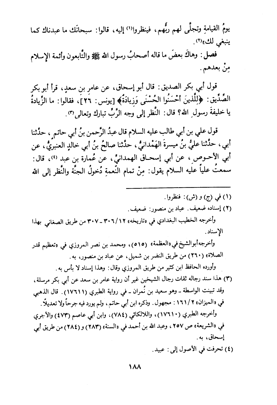 قول أبي بكر الصديق: قال أبو إسحاق، عن عامر بن سعدٍ، قرأ أبو بكر الصديق: {لِلَّذِينَ أَحْسَنُوا الْحُسْنَى وَزِيَادَةٌ} [يونس: 26]، فقالوا: ما الزيادة يا خليفة رسول الله؟ قال: النظر إلى وجه الرب تبارك وتعالى (¬3).