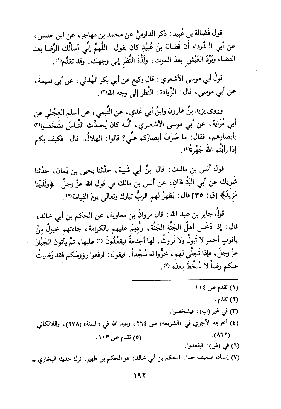 قول فضالة بن عُبيد: ذكر الدارمي عن محمد بن مهاجر، عن ابن حلبس، عن أبي، الدرداء أن فضالة بن عبيدٍ كان يقول: اللهم إني أسألك الرضا بعد القضاء وبرد العيش بعد الموت، ولذة النظر إلى وجهك. وقد تقدم (¬1).