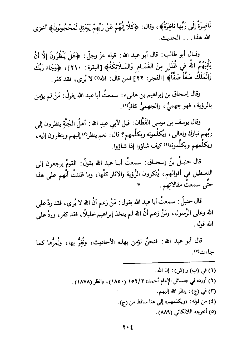 قال حنبلٌ: سمعت أبا عبد الله يقول: من زعم أن الله لا يُرى، فقد ردَّ على الله وعلى الرَّسول، ومن زعم أن الله لم يتخذ إبراهيم خليلاً، فقد كفر، وردَّ على الله قوله.