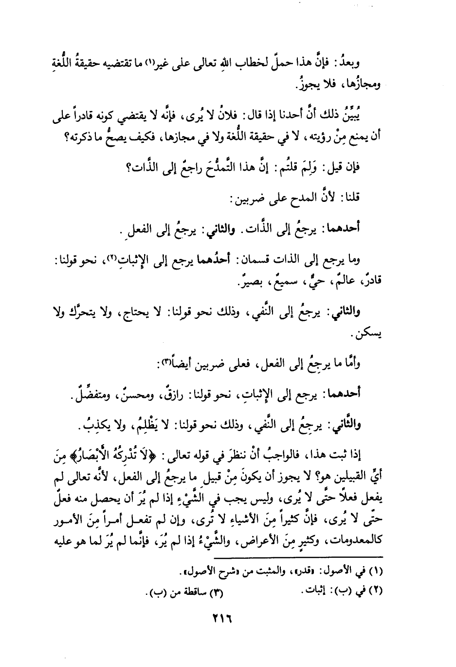 إذا ثبت هذا، فالواجبُ أن ننظر في قوله تعالى: {لا تُدرِكُهُ الأبصارُ} من أيِّ القبيلين هو؟ لا يجوز أن يكون من قبيل ما يرجع إلى الفعل، لأنه تعالى لم يفعل فعلاً حتى لا يُرى، وليس يجب في الشيء إذا لم ير أن يحصل منه فعل حتى لا يُرى، فإن كثيراً من الأشياء لا تُرى، وإن لم تفعل أمراً من الأمور كالمعدومات، وكثيرٍ من الأعراض، والشيء إذا لم يُرَ، فإنما لم يُرَ لما هو عليه