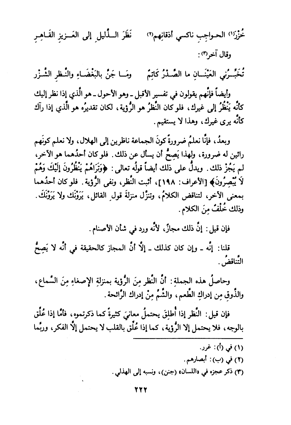 وبعد، فإنا نعلم ضرورة كون الجماعة ناظرين إلى الهلال، ولا نعلم كونهم رائين له ضرورة، ولهذا يَصِحُّ أن يسأل عن ذلك. فلو كان أحدهما هو الآخر، لم يَجُزْ ذلك. ويدلُّ على ذلك أيضاً قوله تعالى: {وتراهُم ينظُرُون إليك وَهُم لا يُبْصِرُون} [الأعراف: 198]، أثبث النظر، ونفي الرؤية. فلو كان أحدهما بمعنى الآخر، لتناقض الكلام، وتنزَّل منزلة قول القائل، يَرَوْنَك ولا يَرَوْنَكَ. وذلك خُلْفٌ من الكلام.