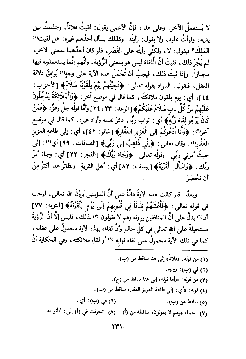 وبعد: فلو كانت هذه الآية دالة على أن المؤمنين يرون الله تعالى، لوجب في قوله تعالى: {فَأَعْقَبَهُمْ نِفَاقًا فِي قُلُوبِهِمْ إِلَى يَوْمِ يَلْقَوْنَهُ} [التوبة: 77] أن (¬6) يدل على أن المنافقين يرونه وهم لا يقولون (¬7) بذلك، فليس إلاَّ أن الرؤية مستحيلةٌ على الله تعالى في كل حالٍ وأن لقاءه بهذه الآية محمولٌ على عقابه، كما في تلك الآية محمولٌ على لقاء ثوابه (¬8) أو لقاء ملائكته، وفي الحكاية أن