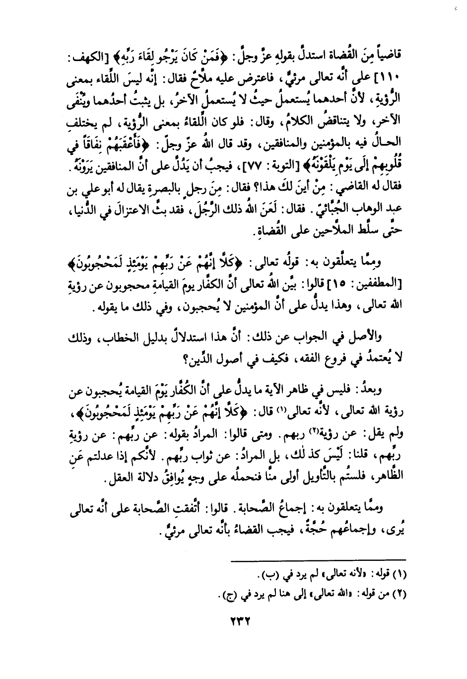 قاضياً من القضاة استدلَّ بقوله عز وجل: {فَمَنْ كَانَ يَرْجُو لِقَاءَ رَبِّهِ} [الكهف: 110] على أنه تعالى مرئيٌّ، فاعترض عليه ملاَّح فقال: إنه ليس اللقاء بمعنى الرؤية، لأن أحدهما يُستعمل حيث لا يستعمل الآخر، بل يثبت أحدهما وينفي الآخر، ولا يتناقض الكلام، وقال: فلو كان اللقاء بمعنى الرؤية، لم يختلف الحال فيه بالمؤمنين والمنافقين، وقد قال الله عز وجل: {فَأَعْقَبَهُمْ نِفَاقًا فِي قُلُوبِهِمْ إِلَى يَوْمِ يَلْقَوْنَهُ} [التوبة: 77]، فيجب أن يدل على أن المنافقين يرونه.