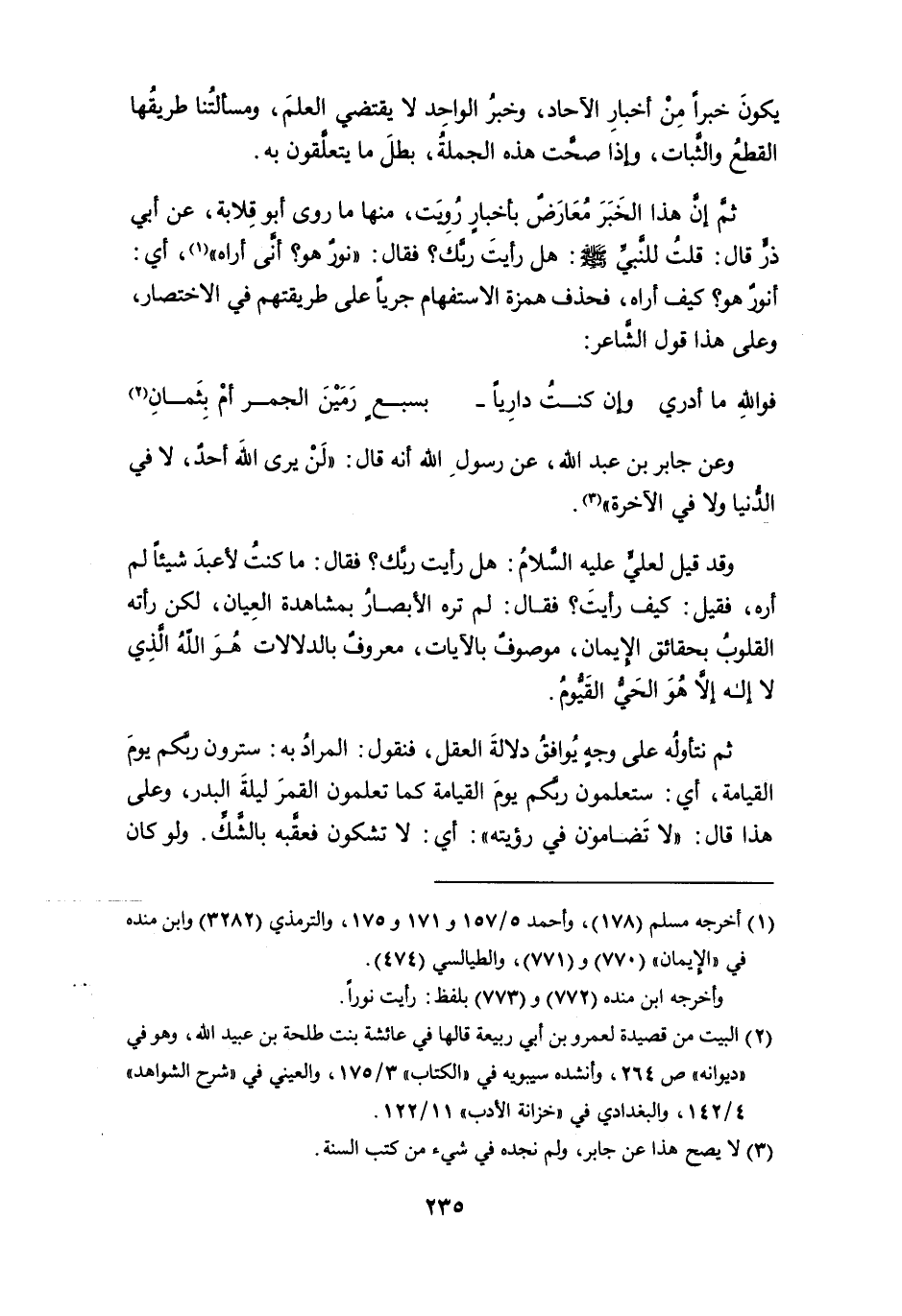 ثم نتأوله على وجهٍ يُوافقُ دلالة العقل، فنقول: المرادُ به: سترون ربكم يوم القيامة، أي: ستعلمون ربكم يوم القيامة كما تعلمون القمر ليلة البدر، وعلى هذا قال: " لا تضامون في رؤيته ": أي: لا تشكون فعقَّبه بالشكِّ. ولو كان