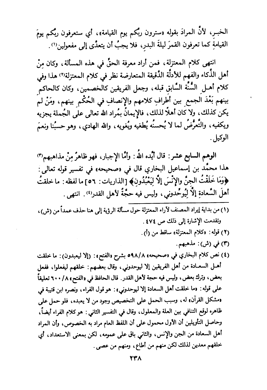 (¬4) نص كلام البخاري في " صحيحه " 8/ 598 بشرح " الفتح ": (إلا ليعبدون): ما خلقت أهل السعادة من أهل الفريقين إلاَّ ليوحدوني، وقال بعضهم: خلقهما ليفعلوا، ففعل بعض، وترك بعض، وليس فيه حجة لأهل القدر. قال الحافظ في " الفتح " 8/ 600 تعليقاً على قوله: " ما خلقت أهل السعادة إلاَّ ليوحدوني ": هو قول الفراء، ونصره ابن قتيبة في " مشكل القرآن " له، وسبب الحمل على التخصيص وجود من لا يعبده، فلو حمل على ظاهره لوقع التنافي ببن العلة والمعلول، وقال في التفسير الثاني: هو كلام الفراء أيضاً، وحاصل التأويلين أن الأول محمول على أن اللفظ العام مراد به الخصوص، وأن المراد أهل السعاده من الجن والإنس، والثاني باق على عمومه، لكن بمعنى الاستعداد، أي خلقهم معدين لذلك لكن منهم من أطاع، ومنهم من عصى.