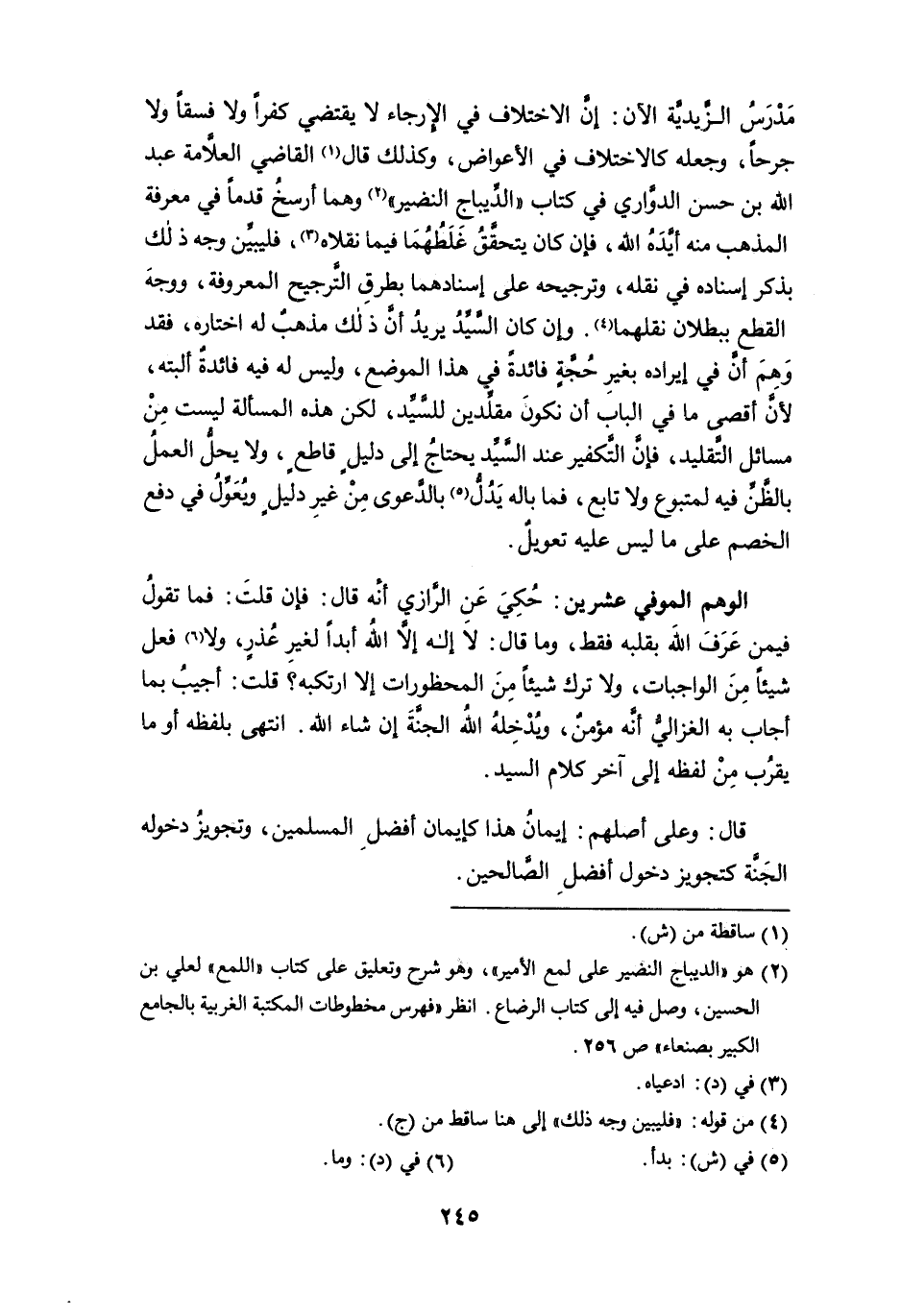 مَدْرَسُ الزيدية الآن: إن الاختلاف في الإرجاء لا يقتضي كفراً ولا فسقاً ولا جرحاً، وجعله كالاختلاف في الأعواض، وكذلك قال (¬1) القاضي العلامة عبد الله بن حسن الدوَّاري في كتاب " الدِّيباج النضير " (¬2) وهما أرسخُ قدماً في معرفة المذهب منه أيده الله، فإن كان يتحقَّقُ غَلَطُهُمَا فيما نقلاه (¬3) فليبيِّن وجه ذلك بذكر إسناده في نقله، وترجيحه على إسنادهما بطرق الترجيح المعروفة، ووجه القطع ببطلان نقلهما (¬4). وإن كان السيد يريد أن ذلك مذهبٌ له اختاره، فقد وَهِمَ أن في إيراده بغير حُجَّةٍ فائدة في هذا الموضع، وليس له فيه فائدة ألبته، لأن أقصى ما في الباب أن نكون مقلِّدين للسيد، لكن هذه المسألة ليست من مسائل التقليد، فإن التكفير عند السيد يحتاج إلى دليلٍ قاطع، ولا يحلُّ العمل بالظَّنِّ فيه لمتبوع ولا تابع، فما باله يدُلُّ (¬5) بالدعوى من غير دليلٍ ويُعَوِّلُ في دفع الخصم على ما ليس عليه تعويل.