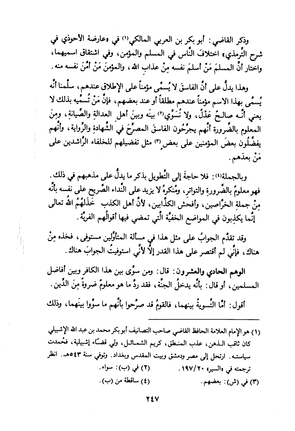 (¬1) هو الإمام العلامة الحافظ القاضي صاحب التصانيف أبو بكر محمد بن عبد الله الإشبيلي كان ثاقب الذهن، عذب المنطق، كريم الشمائل، ولي قضاء إشبيلية، فحُمدت سياسته. ارتحل إلى مصر ودمشق وبيت المقدس وبغداد. وتوفي سنة 543 هـ. انظر ترجمته في " السير " 20/ 197.