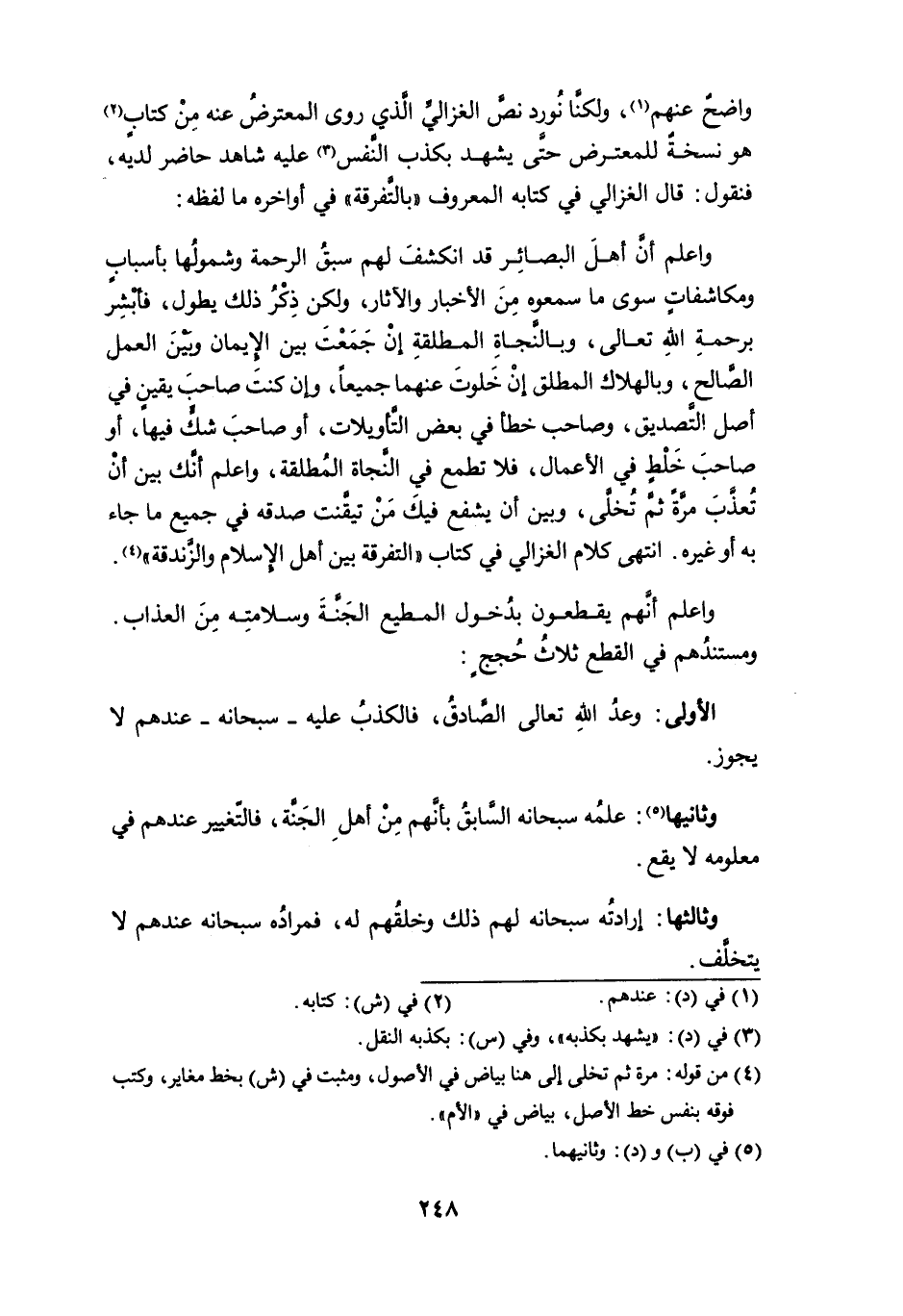 واعلم أن أهل البصائر قد انكشف لهم سبقُ الرحمة وشمولها بأسبابٍ ومكاشفاتٍ سوى ما سمعوه من الأخبار والآثار، ولكن ذِكْرُ ذلك يطول، فأبشر برحمة الله تعالى، وبالنجاة المطلقة إن جَمَعْتَ بين الإيمان وبين العمل الصالح، وبالهلاك المطلق إن خلوتَ عنهما جميعاً، وإن كنتَ صاحب يقينٍ في أصل التصديق، وصاحب خطأ في بعض التأويلات، أو صاحب شكٍّ فيها، أو صاحب خَلْطٍ في الأعمال، فلا تطمع في النجاة المطلقة، واعلم أنك بين أن تُعذَّبَ مرة ثم تُخلَّى، وبين أن يشفع فيك من تيقَّنت صدقه في جميع ما جاء به أو غيره. انتهى كلام الغزالي في كتاب " التفرقة بين أهل الإسلام والزندقة " (¬4).