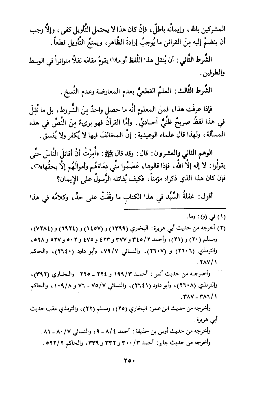 فإذا عرفت هذا، فمن المعلوم أنه ما حصل واحدٌ من الشروط، بل ما نُقِلَ في هذا لفظ صريحٌ ظنِّيٌّ آحادي. وأما القرآن فهو برىءٌ من النصِّ في هذه المسألة، ولهذا قال علماء الوعيدية: إن المخالف فيها لا يُكفر ولا يُفسق.