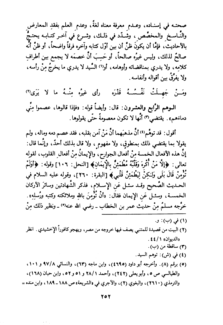 أقول: قد توهَّم (¬4) أن مذهبهما أن من آمن بقلبه، فقد عصم دمه وماله، ولم يقولا بما يقتضي ذلك بمنطوقٍ، ولا مفهومٍ، ولا قال بذلك أحدٌ، وإنما قال: إن هذه الأفعال الخمسة من أفعال الجوارح، والإيمان من أفعال القلوب، لقوله تعالى: {إِلَّا مَنْ أُكْرِهَ وَقَلْبُهُ مُطْمَئِنٌّ بِالْإِيمَان} [النحل: 106] وقوله: {أَوَلَمْ تُؤْمِنْ قَالَ بَلَى وَلَكِنْ لِيَطْمَئِنَّ قَلْبِي} [البقرة: 260]، وقوله عليه السلام في الحديث الصحيح وقد سئل عن الإسلام، فذكر الشهادتين وسائر الأركان الخمسة، وسئل عن الإيمان فقال: " أن تؤمن بالله وملائكته وكتبه ورسله ".