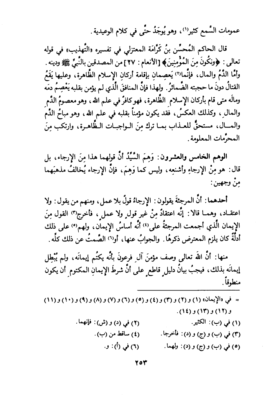 قال الحاكم المُحسِّن بن كرَّامة المعتزلي في تفسيره " التهذيب " في قوله تعالى: {وَنَكُونَ مِنَ الْمُؤْمِنِينَ} [الأنعام: 27] من المصدقين بالنبي - صلى الله عليه وسلم - ودينه.