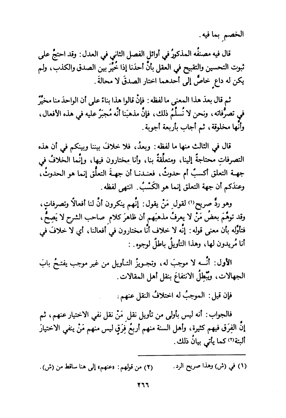 قال فيه مصنفه المذكور في أوائل الفصل الثاني في العدل: وقد احتج على ثبوت التحسين والتقبيح في العقل بأن أحدنا إذا خُيِّرَ بين الصدق والكذب، ولم يكن له داعٍ خاصٌّ إلى أحدهما اختار الصدق لا محالة.