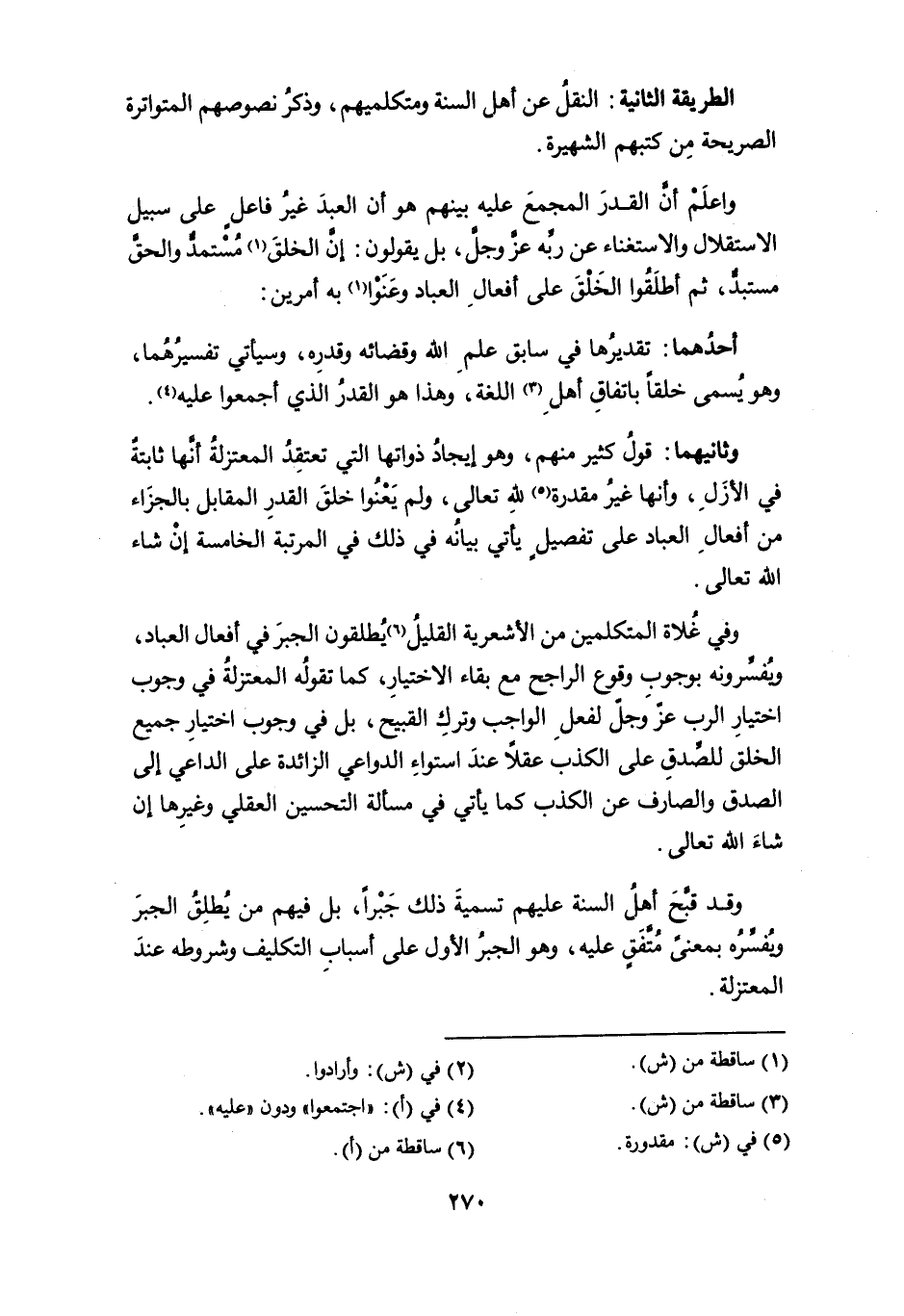 وثانيهما: قول كثير منهم، وهو إيجاد ذواتها التي تعتقد المعتزلة أنها ثابتة في الأزل، وأنها غير مقدرة (¬5) لله تعالي، ولم يَعْنُوا خلق القدر المقابل بالجزاء من أفعال العباد على تفصيلٍ يأتي بيانه في ذلك في المرتبة الخامسة إن شاء الله تعالى.
