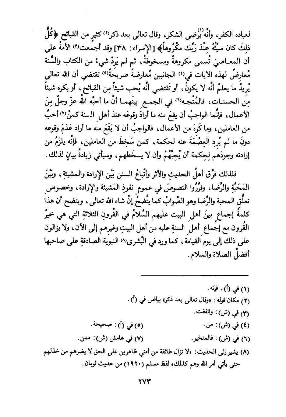 فلذلك فرّق أهل الحديث والأثر وأتباع السنن بين الإرادة والمشيئة، وبين المحبة والرضا، وقرَّروا النصوص في عموم نفوذ المشيئة والإرادة، وخصوص تعلُّق المحبة والرضا وهو الصواب كما يتضحُ إن شاء الله تعالى، ويتضح أن هذا كلمة إجماع بين أهل البيت عليهم السلام في القرون الثلاثة التي هي خيرُ القرون مع إجماع أهل السنة عليه من أهل البيت وغيرهم إلى الآن، ولا يزالون على ذلك إلى يوم القيامة، كما ورد في البُشرى (¬8) النبوية الصادقة على صاحبها أفضل الصلاة والسلام.