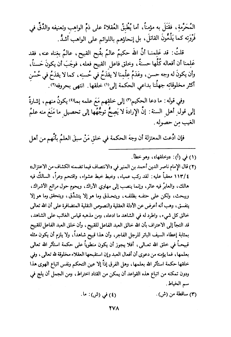 (¬2) قال الإمام ناصر الدين أحمد بن المنير في " الانتصاف فيما تضمنه الكشاف من الاعتزال " 4/ 113 معقباً عليه: لقد ركب عمياء، وخبط خبط عشواء، واقتحم وعراً، السالك فيه هالك، والعابرُ فيه عاثر، وإنما ينصب إلى مهاوي الأراك، ويحوم حول مراتع الأشراك، ويبحث، ولكن على حتفه بظلفه، ويتحذق وما هو إلاَّ يتشدَّق، ويتحقق وما هو إلا يتفسق، وهب أنه أعرض عن الأدلة العقلية والنصوص النقلية المتضافرة على أن الله تعالى خالق كل شيء، واطرد له في الشاهد ما ادعاه، ومن مذهبه قياس الغائب على الشاهد، قد التجأ إلى الاعتراف بأن الله خالق العبد الفاعل للقبيح، وأن خلق العبد الفاعل للقبيح بمثابة إعطاء السيف الباتر للرجل الفاجر، وأن هذا قبيح شاهداً، ولا يلزم أن يكون مثله قبيحاً في خلق الله تعالى، أفلا يجوز أن يكون منطوياً على حكمة استأثر الله تعالى بعلمها، فما يؤمنه من دعوى أن أفعال العبد وإن استقبحها العقلاء مخلوقة لله تعالى، وفي خلقها حكمة استأثر الله بعلمها، وهل الفرق إذا إلاَّ عين التحكم ونفس اتباع الهوى هذا ودون تمكنه من اتباع هده القواعد أن يمكن من القتاد اختراط، ومن الجمل أن يلج في سم الخياط.