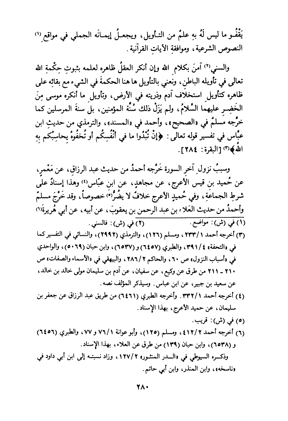 والسني (¬2) آمن بكلام الله وإن أنكر العقل ظاهره لعلمه بثبوت حكمة الله تعالى في تأويله الباطن، ونعني بالتأويل ها هنا الحكمة في الشيء مع بقائه على ظاهره كتأويل استخلاف آدم وذريته في الأرض، وتأويل ما أنكره موسى من الخَضِرِ عليهما السلام، ولم يَزَلْ ذلك سُنَّة المؤمنين، بل سنة المرسلين كما خرَّجه مسلمٌ في " الصحيح "، وأحمد في " المسند "، والترمذي من حديث ابن عبَّاس في تفسير قوله تعالى: {إِنْ تُبْدُوا مَا فِي أَنْفُسِكُمْ أَوْ تُخْفُوهُ يُحَاسِبْكُمْ بِهِ اللَّه} (¬3) [البقرة: 284].