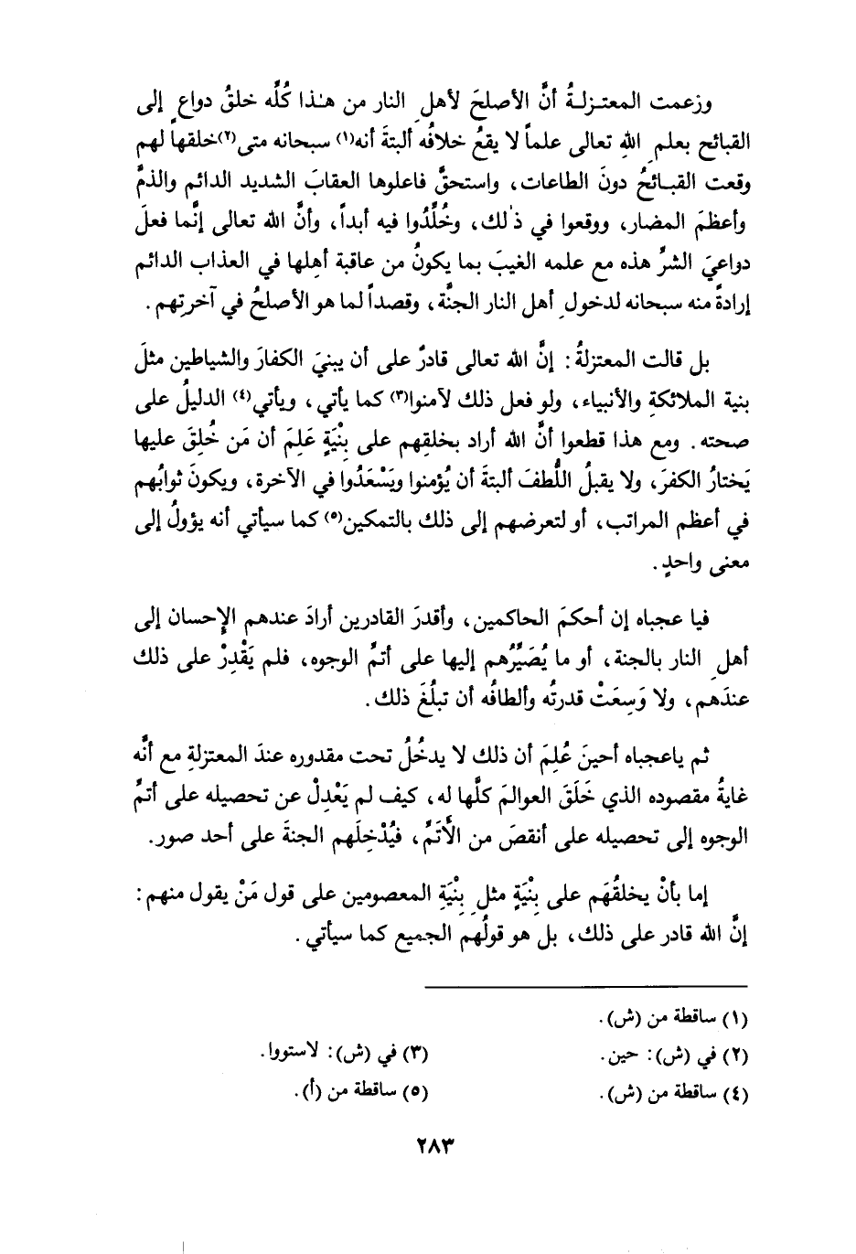 ثم يا عجباه أحين عُلِمَ أن ذلك لا يدخُلُ تحت مقدوره عند المعتزلة مع أنه غاية مقصوده الذي خلق العوالم كلَّها له، كيف لم يعدل عن تحصيله على أتم الوجوه إلى تحصيله على أنقص من الأتَمِّ، فيدخلهم الجنة على أحد صور.