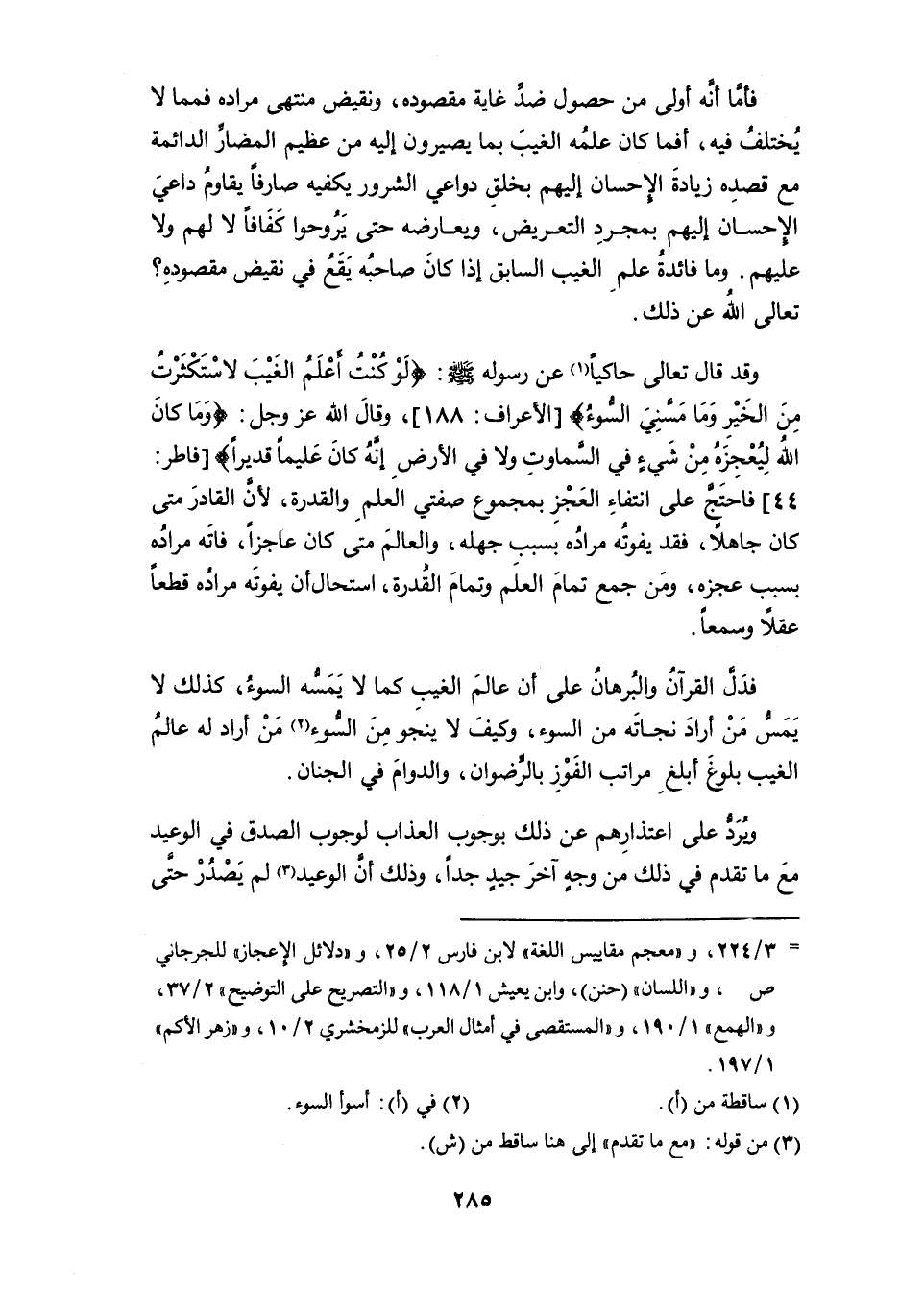 فدلَّ القرآن والبرهان على أن عالم الغيب كما لا يَمَسُّه السوء، كذلك لا يمسُّ من أراد نجاته من السوء، وكيف لا ينجو من السُّوء (¬2) من أراد له عالم الغيب بلوغ أبلغ مراتب الفوز بالرضوان، والدوام في الجنان.