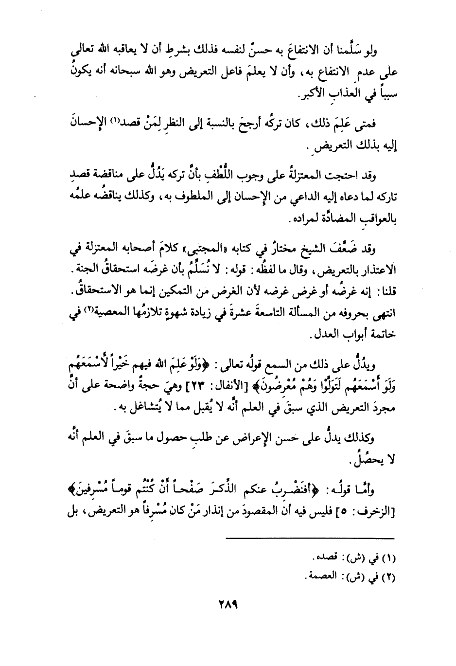 وقد ضَعَّفَ الشيخ مختار في كتابه " المجتبى " كلام أصحابه المعتزلة في الاعتذار بالتعريض، وقال ما لفظه: قوله: لا نُسَلِّمُ بأن غرضه استحقاق الجنة.