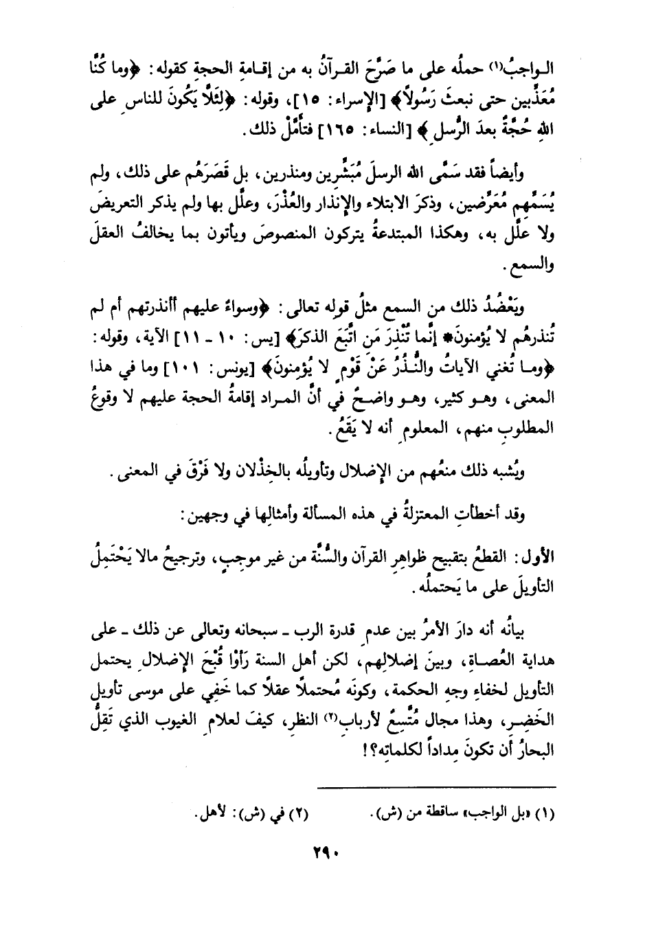 بيانه أنه دار الأمر بين عدم قدرة الرب -سبحانه وتعالى عن ذلك- على هداية العُصاة، وبين إضلالهم، لكن أهل السنة رَأوْا قُبْحَ الإضلال يحتمل التأويل لخفاء وجه الحكمة، وكونه مُحتملاً عقلاً كما خَفِي على موسى تأويل الخَضِرِ، وهذا مجال مُتَّسِعٌ لأربابِ (¬2) النظر، كيف لعلام الغيوب الذي تَقِلُّ البحار أن تكون مِداداً لكلماته؟!