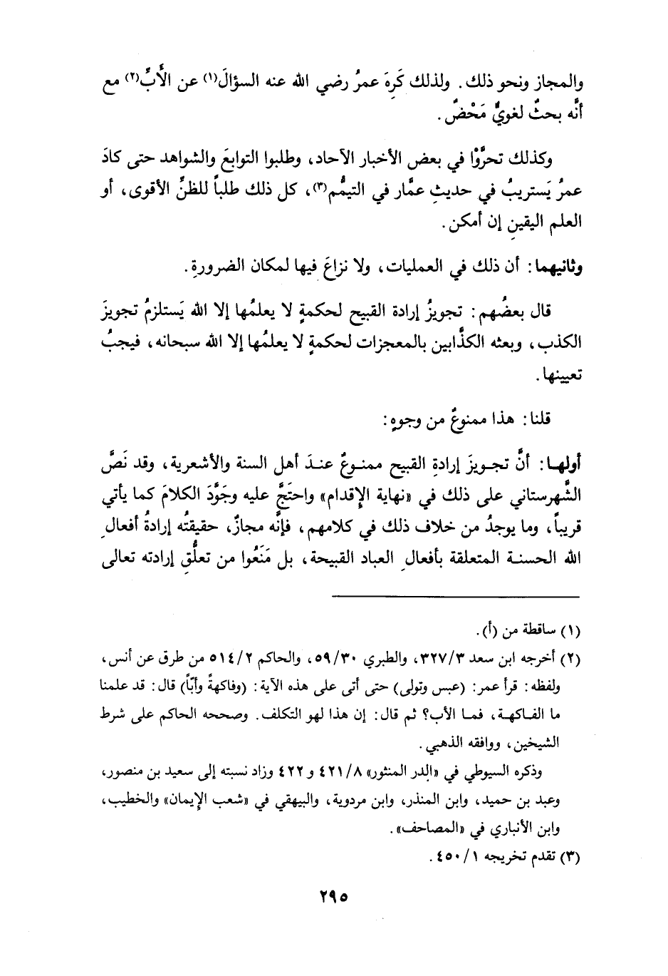 أولها: أن تجويز إرادة القبيح ممنوعٌ عند أهل السنة والأشعرية، وقد نصَّ الشهرستاني على ذلك في " نهاية الإقدام " واحتجَّ عليه وجوَّد الكلام كما يأتي قريباً، وما يوجد من خلاف ذلك في كلامهم، فإنه مجازٌ، حقيقته إرادة أفعال الله الحسنة المتعلقة بأفعال العباد القبيحة، بل منعوا من تعلُّق إرادته تعالى