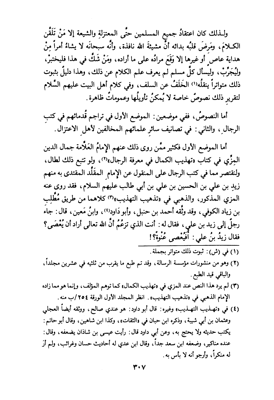 أما الموضع الأول فكثير ممن روى ذلك عنهم الإمام العلامة جمال الدين المِزِّي في كتاب " تهذيب الكمال في معرفة الرجال " (¬2)، ولو تتبع ذلك لطال، ولنقتصر مما في كتب الرجال على المنقول عن الإمام المقَلَّد المقتدى به منهم زيد بن علي بن الحسين بن علي بن أبي طالب عليهم السلام، فقد روى عنه المزي المذكور، والذهبي في " تذهيب التهذيب " (¬3) كلاهما من طريق مُطَّلِب بن زياد الكوفي، وقد وثَّقه أحمد بن حنبل، وأبو داود (¬4)، وابن معين، قال: جاء رجلٌ إلى زيد بن علي، فقال له: أنت الذي تزعم أن الله تعالى أراد أن يُعْصَى؟ فقال زيد بن علي: أفَيُعْصى عُنْوةً؟!