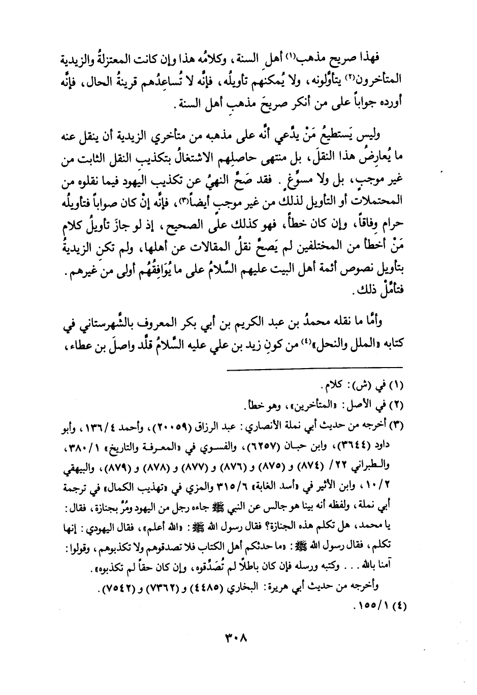 وليس يستطيع من يدعي أنه على مذهبه من متأخري الزيدية أن ينقل عنه ما يعارض هذا النقل، بل منتهى حاصلهم الاشتغال بتكذيب النقل الثابت من غير موجبٍ، بل ولا مسوِّغٍ. فقد صحَّ النهي عن تكذيب اليهود فيما نقلوه من المحتملات أو التأويل لذلك من غير موجب أيضاً (¬3)، فإنه إن كان صواباً فتأويله حرام وِفاقاً، وإن كان خطأ، فهو كذلك على الصحيح، إذ لو جاز تأويل كلام من أخطأ من المختلفين لم يصح نقل المقالات عن أهلها، ولم تكن الزيدية بتأويل نصوص أئمة أهل البيت عليهم السلام على ما يوافقهم أولى من غيرهم.