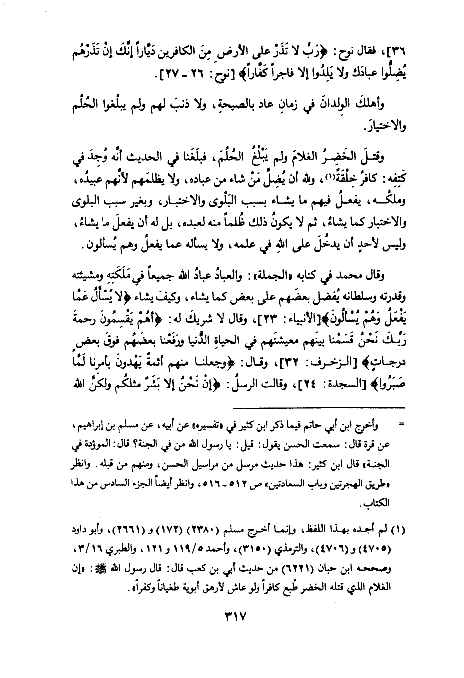 وقال محمد في كتابه " الجملة ": والعباد عباد الله جميعاً في مَلَكَتِه ومشيئته وقدرته وسلطانه يُفضل بعضهم على بعض كما يشاء، وكيف يشاء {لَا يُسْأَلُ عَمَّا يَفْعَلُ وَهُمْ يُسْأَلُونَ} [الأنبياء: 23]، وقال لا شريك له: {أَهُمْ يَقْسِمُونَ رَحْمَتَ رَبِّكَ نَحْنُ قَسَمْنَا بَيْنَهُمْ مَعِيشَتَهُمْ فِي الْحَيَاةِ الدُّنْيَا وَرَفَعْنَا بَعْضَهُمْ فَوْقَ بَعْضٍ دَرَجَات} [الزخرف: 32]، وقال: {وَجَعَلْنَا مِنْهُمْ أَئِمَّةً يَهْدُونَ بِأَمْرِنَا لَمَّا صَبَرُوا} [السجدة: 24]، وقالت الرسل: {إنْ نحنُ إلاَّ بَشَرٌ مثلكُم ولكنَّ الله