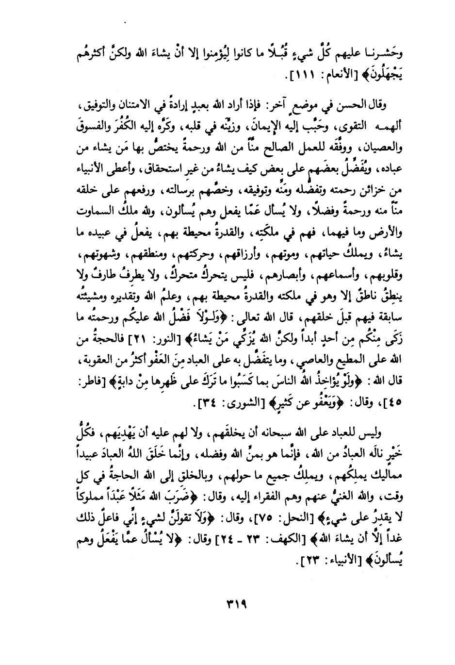 وقال الحسن في موضعٍ آخر: فإذا أراد الله بعبدٍ إرادةً في الامتنان والتوفيق، ألهمه التقوى، وحبَّب إليه الإيمان، وزيَّنه في قلبه، وكرَّه إليه الكفر والفسوق والعصيان، ووفَّقَه للعمل الصالح منَّاً من الله ورحمة يختص بها من يشاء من عباده، ويُفَضِّلُ بعضهم على بعض كيف يشاء من غير استحقاق، وأعطى الأنبياء من خزائن رحمته وتفضُّله ومَنِّه وتوفيقه، وخصَّهم برسالته، ورفعهم على خلقه منَّاً منه ورحمةً وفضلاً، ولا يُسأل عما يفعل وهم يُسألون، ولله ملك السماوت والأرض وما فيهما، فهم في ملكَتِه، والقدرة محيطة بهم، يفعل في عبيده ما يشاء، ويملك حياتهم، وموتهم، وأرزاقهم، وحركتهم، ومنطقهم، وشهوتهم، وقلوبهم، وأسماعهم، وأبصارهم، فليس يتحرك متحركٌ، ولا يطرِفُ طارفٌ ولا ينطِقُ ناطقٌ إلاَّ وهو في ملكته والقدرة محيطة بهم، وعلم الله وتقديره ومشيئته سابقة فيهم قبل خلقهم، قال الله تعالى: {وَلَوْلَا فَضْلُ اللَّهِ عَلَيْكُمْ وَرَحْمَتُهُ مَا زَكَى مِنْكُمْ مِنْ أَحَدٍ أَبَدًا وَلَكِنَّ اللَّهَ يُزَكِّي مَنْ يَشَاءُ} [النور: 21] فالحجة من الله على المطيع والعاصي، وما يتفَضَّل به على العباد من العفو أكثرُ من العقوبة، قال الله: {وَلَوْ يُؤَاخِذُ اللَّهُ النَّاسَ بِمَا كَسَبُوا مَا تَرَكَ عَلَى ظَهْرِهَا مِنْ دَابَّة} [فاطر: 45]، وقال: {ويَعْفُو عن كثيرٍ} [الشورى: 34].