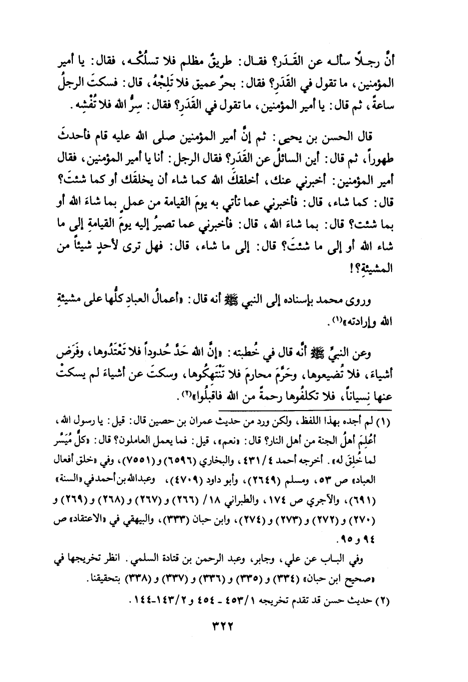 وروى محمد بإسناده إلى النبي - صلى الله عليه وسلم - أنه قال: " أعمال العباد كلُّها على مشيئة الله وإرادته " (¬1).