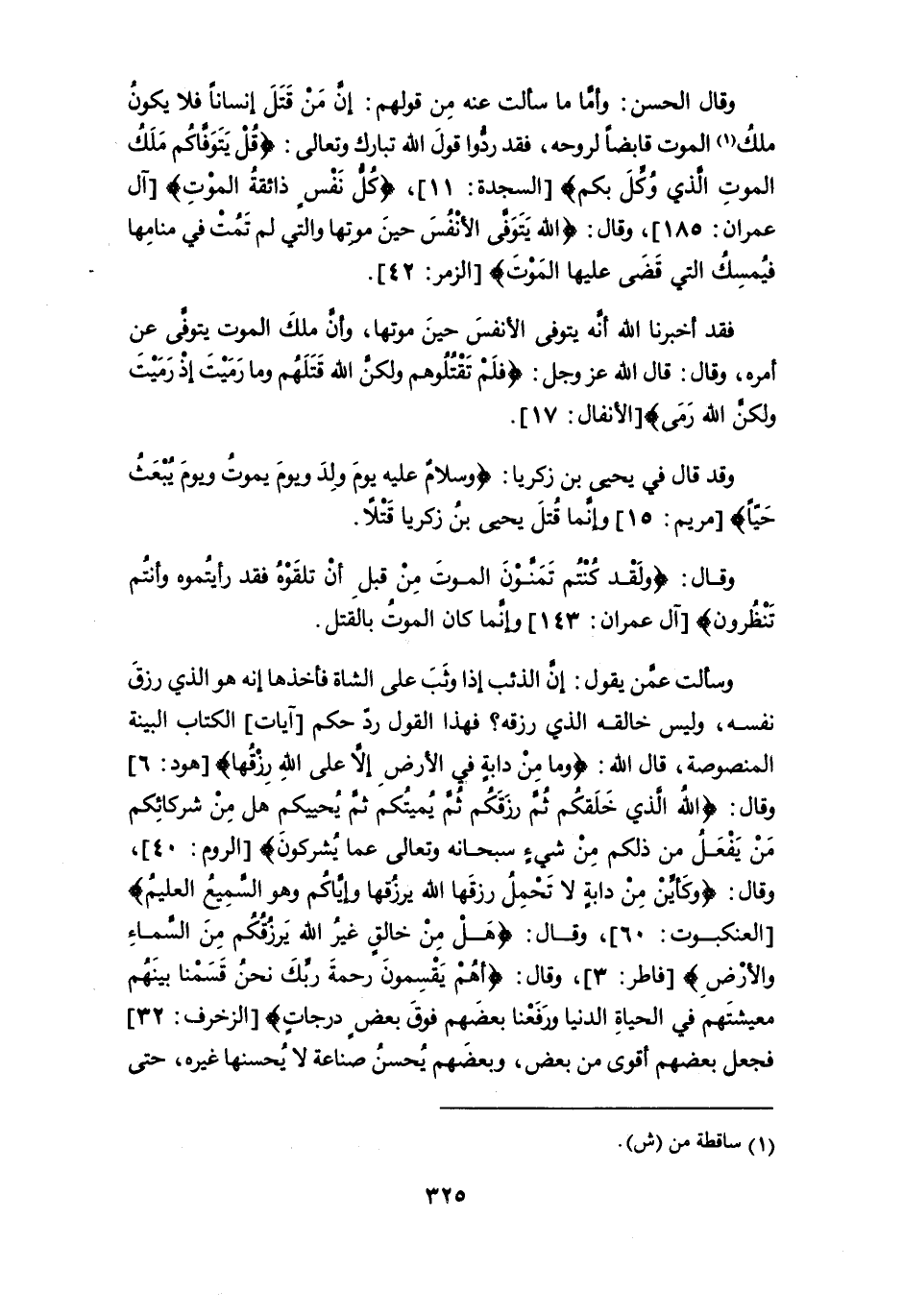 وقال الحسن: وأما ما سألت عنه من قولهم: إنَّ من قتل إنساناً فلا يكون ملكُ (¬1) الموت قابضاً لروحه، فقد ردُّوا قول الله تبارك وتعالى: {قُلْ يَتَوَفَّاكُم مَلَكُ الموتِ الذي وُكِّلَ بكم} [السجدة: 11]، {كُلُّ نَفْسٍ ذائقةُ الموتِ} [آل عمران: 185]، وقال: {اللَّهُ يَتَوَفَّى الْأَنْفُسَ حِينَ مَوْتِهَا وَالَّتِي لَمْ تَمُتْ فِي مَنَامِهَا فَيُمْسِكُ الَّتِي قَضَى عَلَيْهَا الْمَوْت} [الزمر: 42].